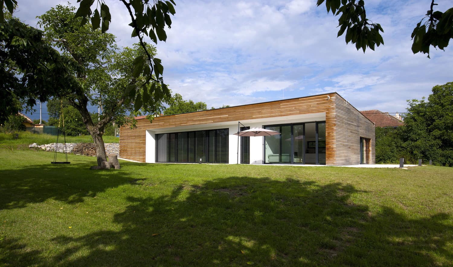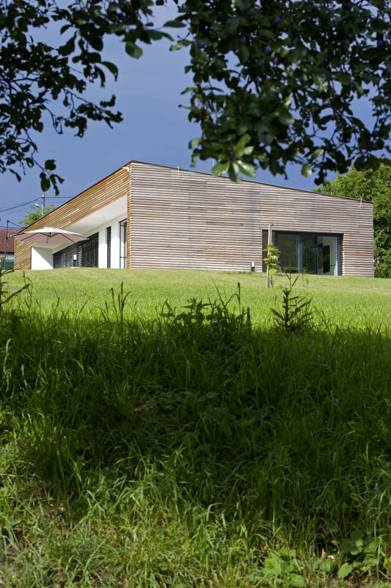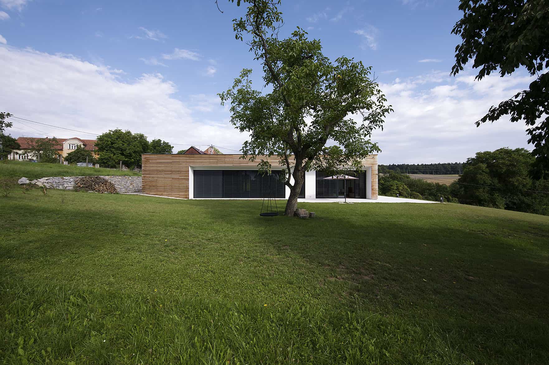 Přirozeně usazená do zeleného sadu leží moderní novostavba obložená lamelami z cedrového dřeva. Půdorysem i měřítkem vypráví příběh dvorcové zástavby jihomoravské vesnice, dává mu však z cela nový obsah z dílny architekta ondřeje Pšenčíka.