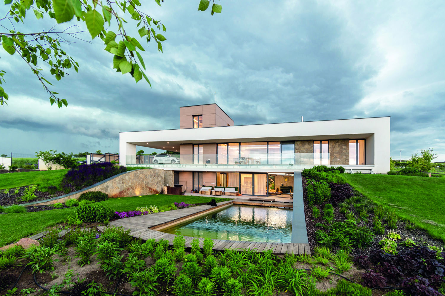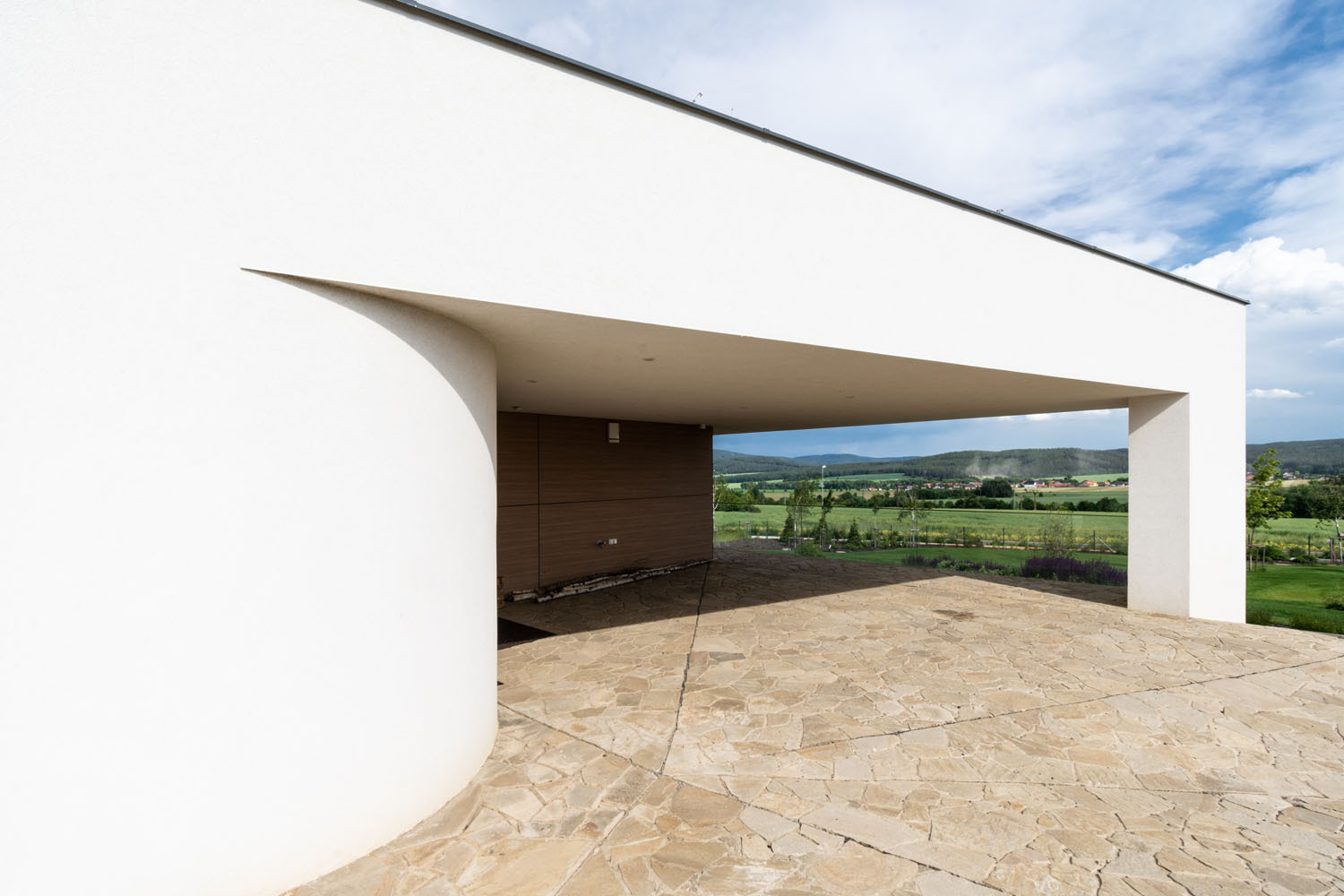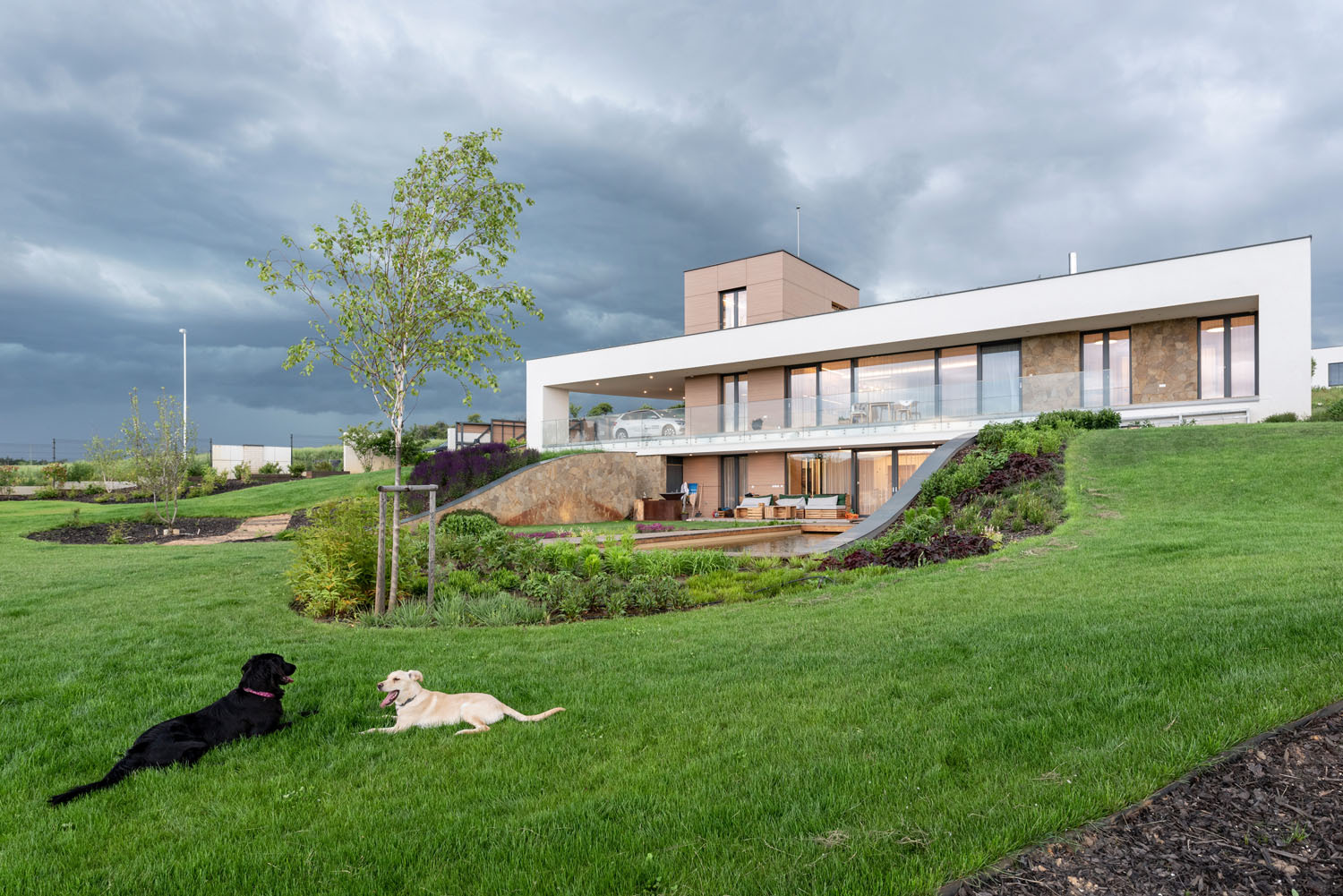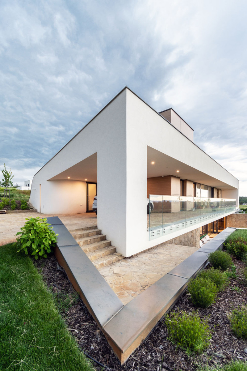 Zadáním bylo navrhnout v okrajové části obce nadstandardní bydlení pro rodinu s dětmi, která má široké zájmy, má ráda společnost a chce si užívat krásné okolní prostředí. Zároveň bylo důležité i zachování soukromí. „Stavebníci si přáli, aby dům působil spíše nenápadně. Pozemek s převýšením zhruba o výšku jednoho podlaží se pro tento záměr dobře hodil. Vytvořili jsme dva na sebe navazující terénní valy, v nichž se dům ‚schovává‘. Má bezbariérově řešené hlavní obytné podlaží, střešní ateliér a obytný suterén se samostatným přístupem zvenku,“ vysvětluje architekt Martin Náhlovský z ateliéru Master Design.