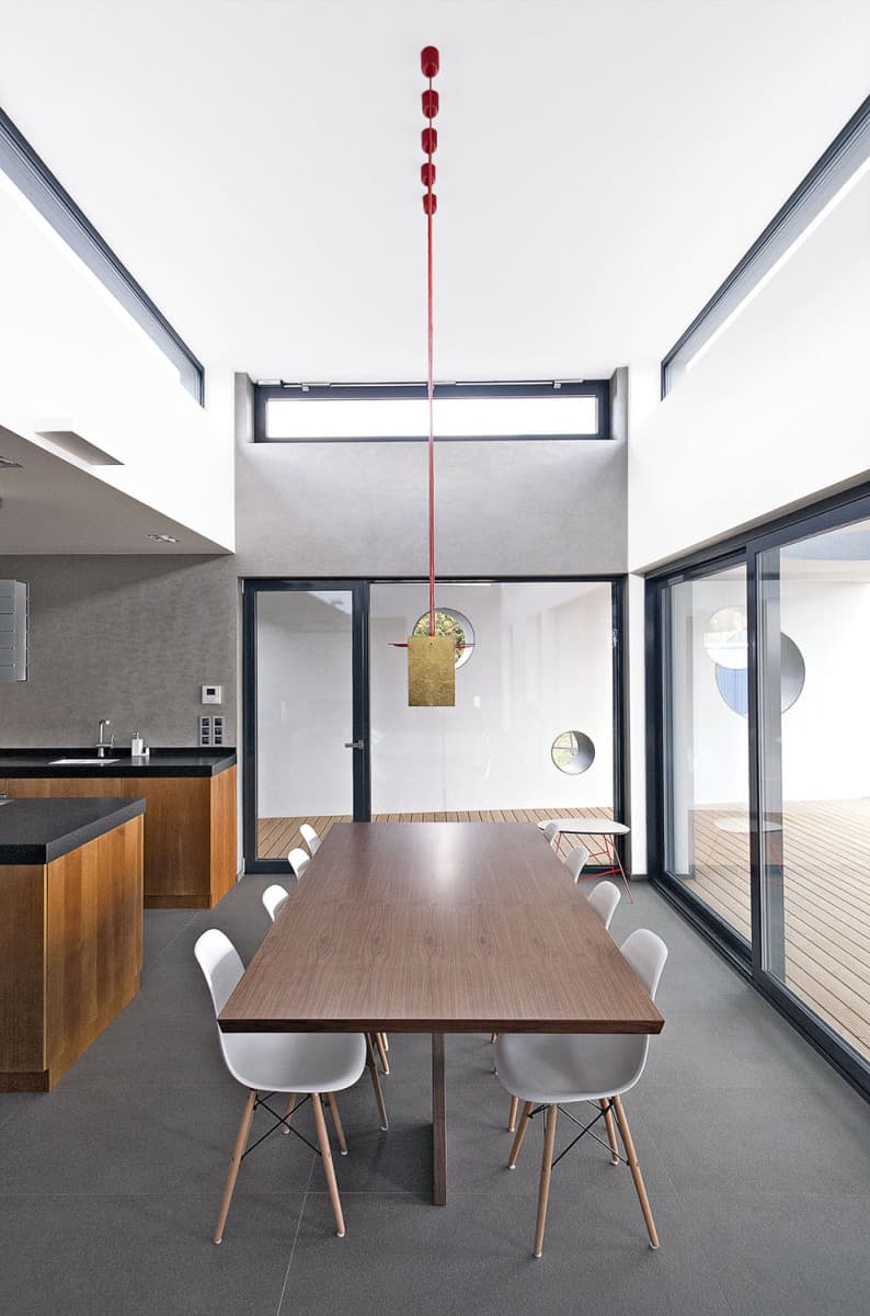 Krásný pozemek nad městem se architekti z ateliéru Lab13 snažili maximálně využít, a proto stavbu zasadili na hrany parcely tak, že dává velký prostor pobytové zahradě pod sebou „Dům po stranách lícuje s pozemkem, který jasně definuje jeho tvar,“ říká jeden z týmu autorů realizace, architekt Martin Vomastek.