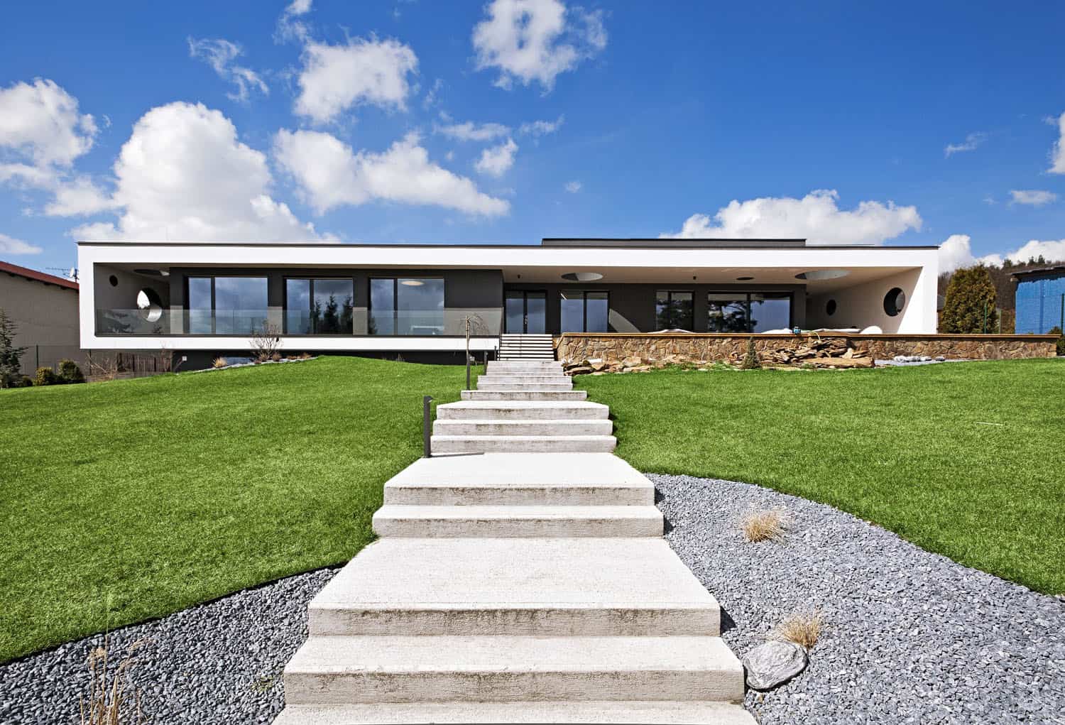 Protáhlý kvádr ve stráni nad městem směřuje tváří do údolí, pohled upřený přes zahradu na vzdálené kontury budov pod sebou. Objekt nastavený jižnímu slunci ukrývá členité útroby v plášti bílého lichoběžníku, jenž rámuje svět majitelů do kompaktního celku bez ambic komunikovat s okolní zástavbou.