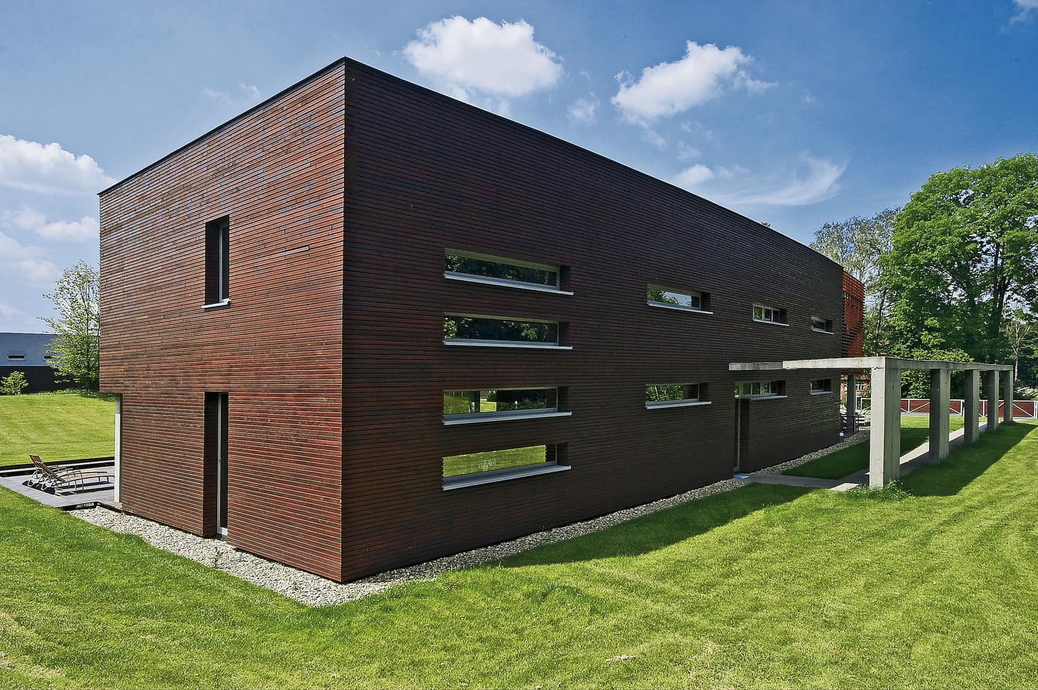 Nahradíme-li v duchu dřevěné obložení bílou omítkou, připomene nám čelní pohled na nový dům v malé obci poblíž Ostravy jedno ze stěžejních děl slavného funkcionalistického architekta.