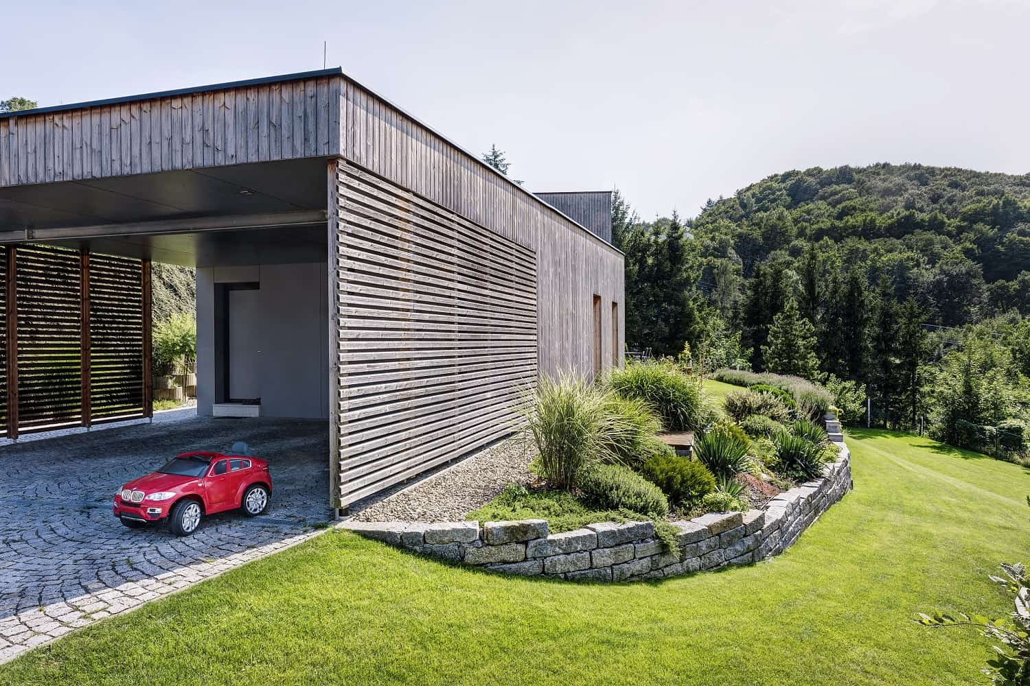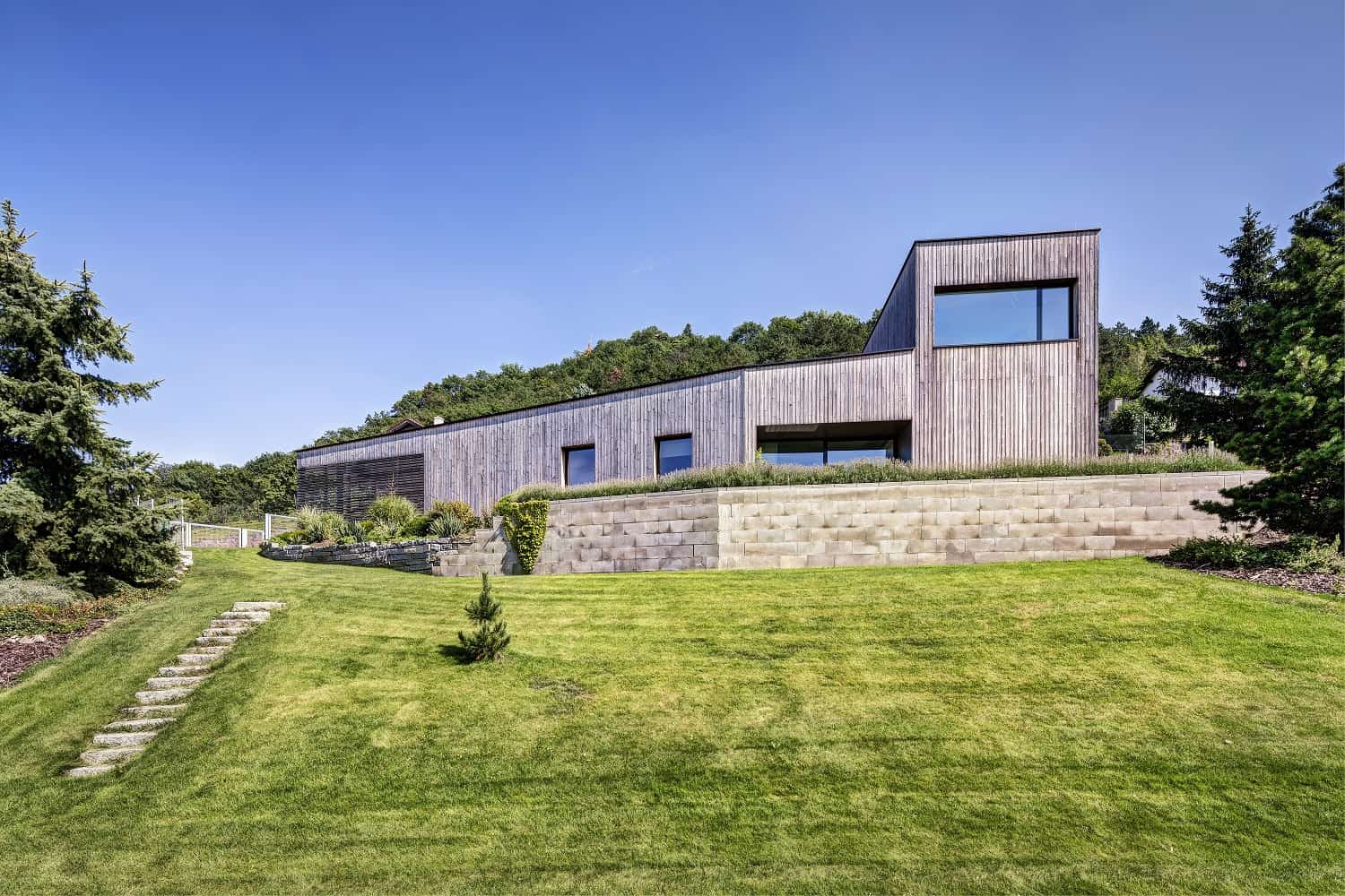 Střecha kopíruje profil ulice a „nekrade“ výhled do hluboké, rozlehlé krajiny pod nohama. Perfektně zasazená na příkře svažitý pozemek se z ulice tváří nenápadně, při pohledu ze zahrady však stavba pozvolna graduje do věže – reminiscence hradu, jenž se tyčí na vrcholu kopce. „Je pro mě důležité být maximálně pokorný k místu a co nejvíce splynout s okolím,“ říká autor projektu, architekt Jan Alex Řezáč.