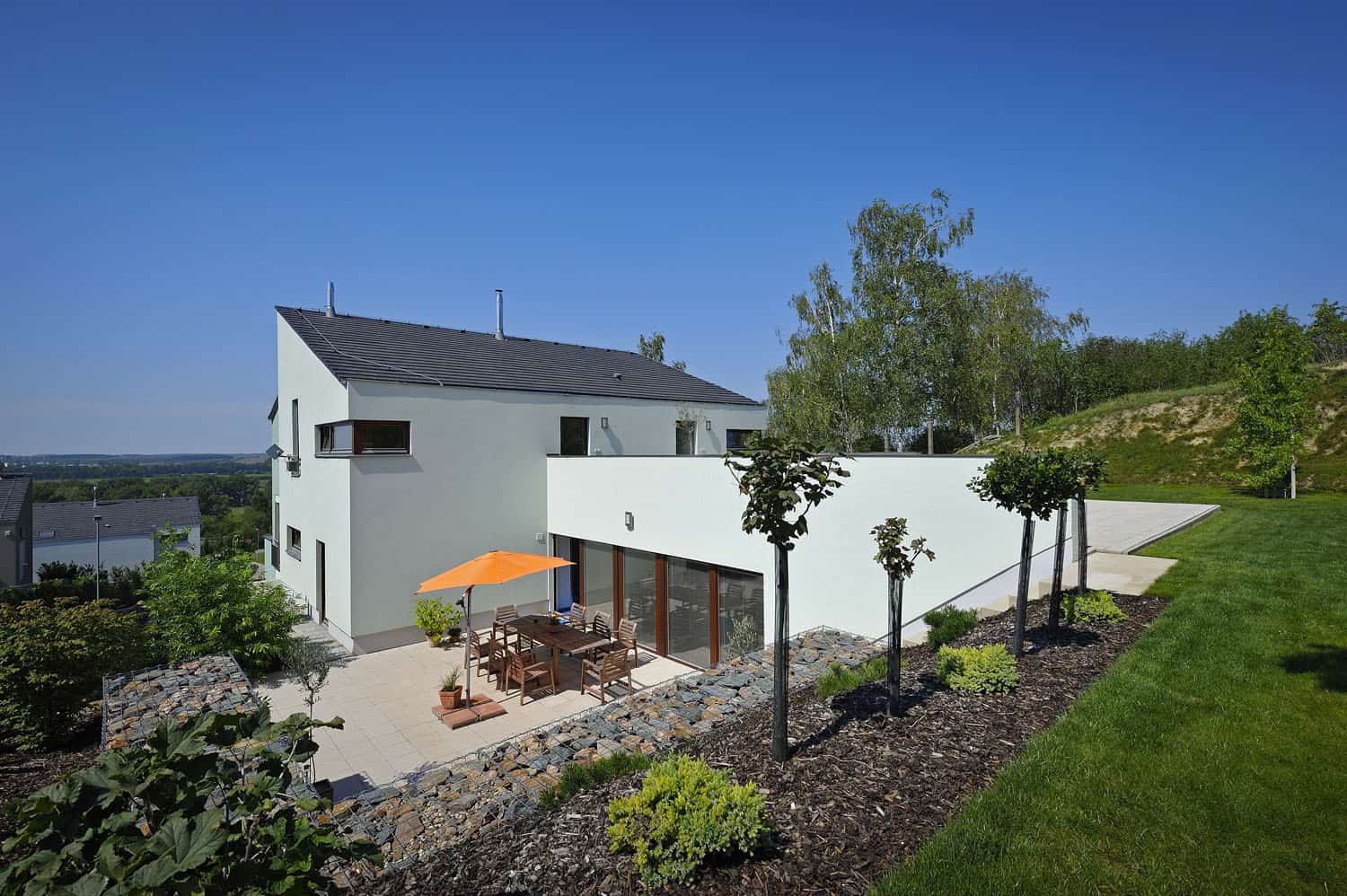 Majitel domu, který jsme navštívili, má za sebou již dvě stavby rodinného domu. V mnoha rodinách již první zkušenost vede k rozhodnutí „již nikdy více“, náš hostitel se naopak rozhodl ji maximálně využít a zkusit štěstí i do třetice. Zakoupil hrubou stavbu rodinného domu od developerské společnosti a dokončil ji k obrazu svému. Líbilo se mu především místo. Dvanáct domů stojí ve svahu ve třech řadách nad sebou.