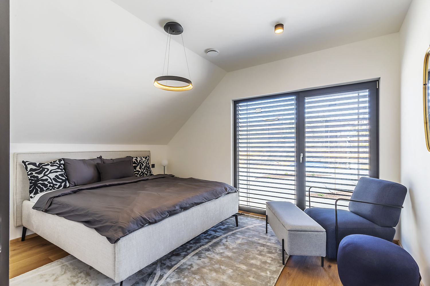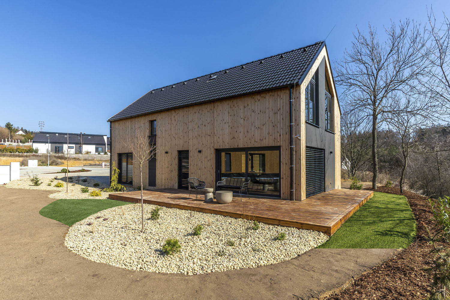 První kompletně dokončený dům slouží jako vzorový dům firmy Lucern moderní dřevostavby. Má tradiční tvar se sedlovou střechou a moderní design. Převážnou část přízemí zaujímá velký obývací pokoj s jídelnou krásně prosvětlený velkým prosklením. Dále tu najdeme pracovnu, která může být využívána jako pokoj pro hosty, koupelnu se sprchou a spíž. V podkroví je situována ložnice se šatnou, koupelna a WC a dva dětské pokoje. V dětských pokojích stojí za zmínku částečné otevření prostoru do krovu, které pokoje ozvláštňuje a zútulňuje.