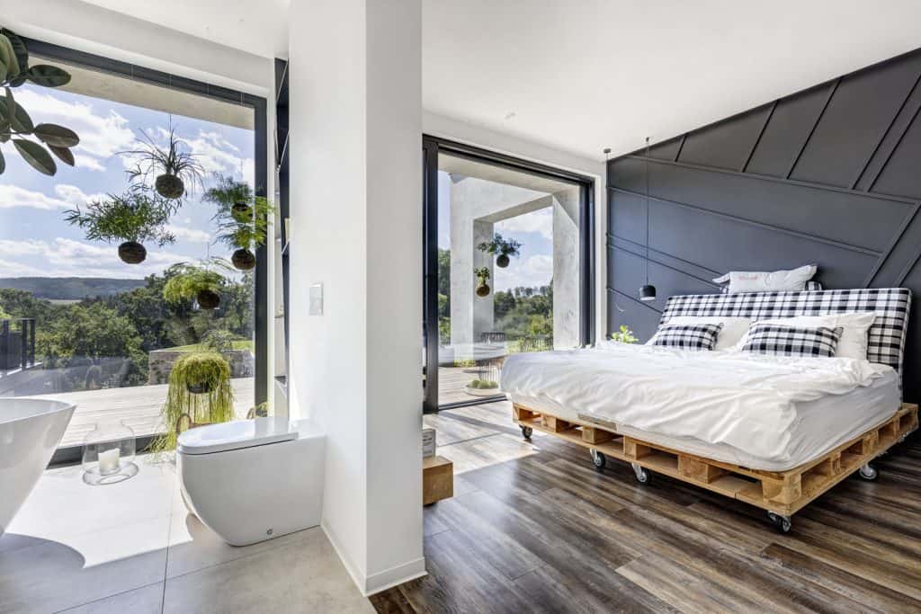 Je až neuvěřitelné, kolik věcí si manželé v domě i na zahradě navrhli a vyrobili sami. Patří k nim například postel z dřevěných palet, ze stejného materiálu je i police v kuchyni, obojí pochází z dílny pána domu.