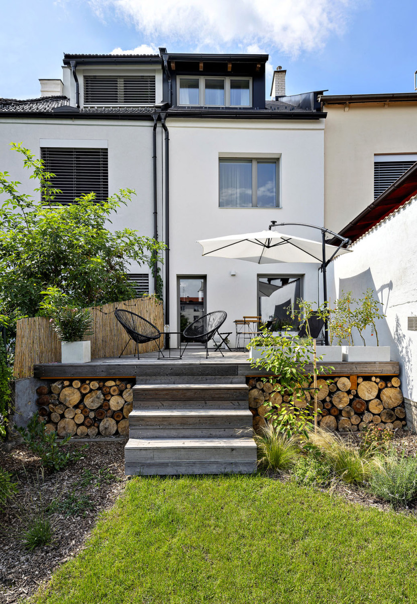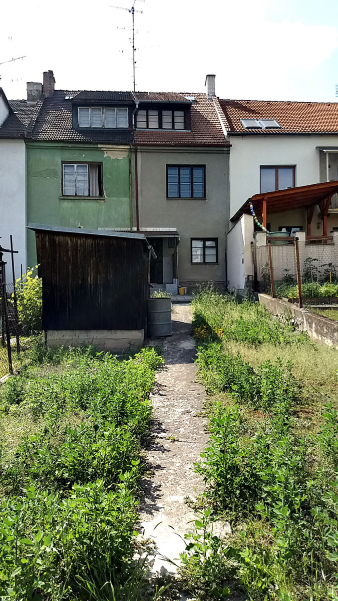 Rodina si koupila vysněný malý řadový dům v širším centru Brna, který jim umožňuje dojít pěšky do práce, škol, školek, na nákup i do centra města. Kromě celkové modernizace vyžadoval především úpravu dispozice pro pětičlennou domácnost a propojení se zahradou v duchu současných trendů. Při rekonstrukci se architekti museli vypořádat s limitovaným rozpočtem, s malou šířkou a výškovými poměry na pozemku. Do domu se vchází z ulice, vzhledem ke svažitosti terénu je vstup umístěn téměř o celou výšku podlaží nad úrovní zahrady, která je orientována na jih.