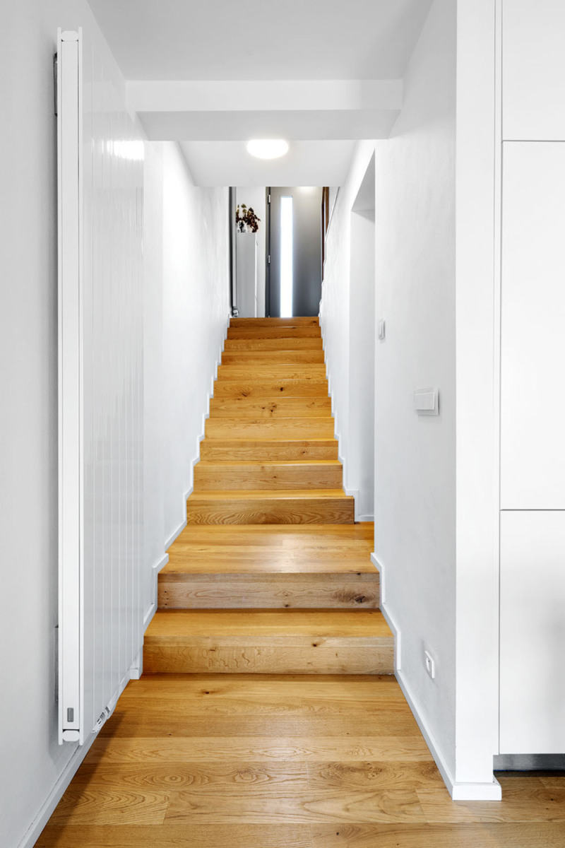 V nejnižším podlaží, původně suterénu, se nacházela obytná kuchyň, úzká chodba vedoucí na zahradu, koupelna a WC. Vlastní obývací pokoj byl v patře, bez balkonu nebo terasy, největší potenciál nabízelo podkroví. „Rozhodli jsme se dispozici upravit tak, aby co nejvíc vyhovovala potřebám rodiny, klíčová byla především návaznost obytného prostoru na terasu a zahradu. Také jsme se snažili orientovat většinu obytných místností do klidného vnitrobloku. Vzhledem k poloze nosných stěn a celkovému nedostatku místa bylo hlavním tématem přestavby hledání úsporných řešení bez velkého nároku na prostor,“ vysvětluje architekt Libor Kaplan, autor návrhu rekonstrukce.