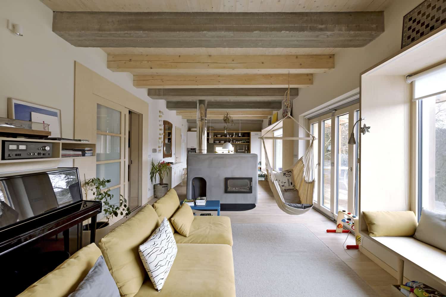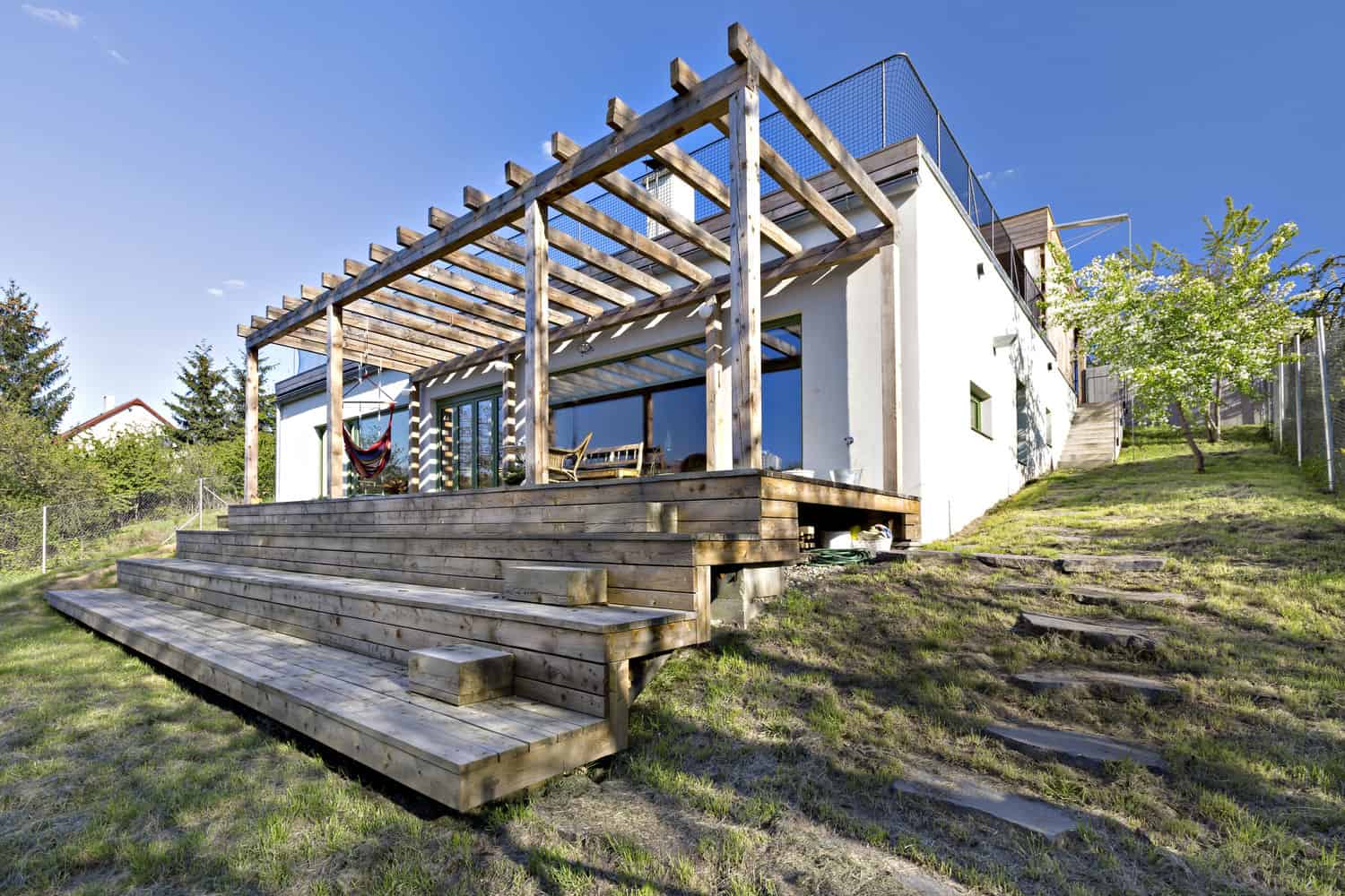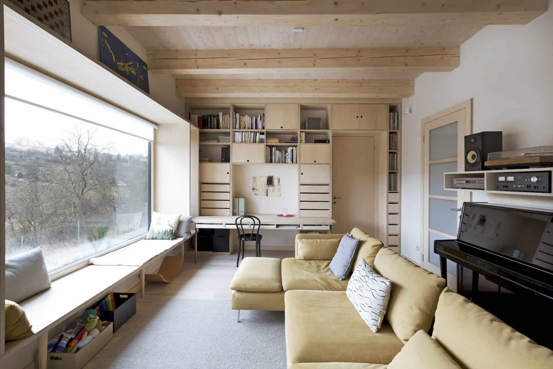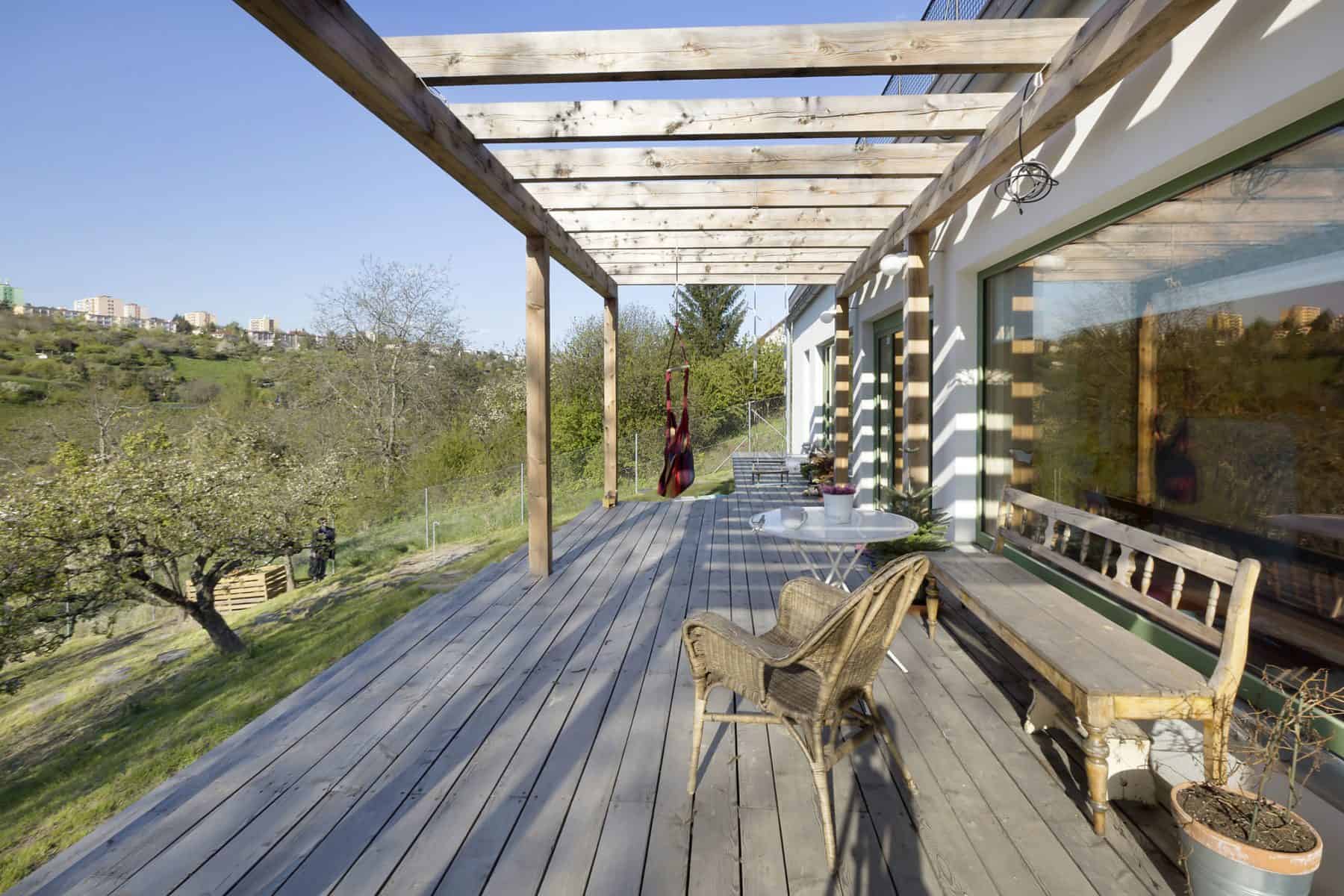 O všem dojem nerozhodnosti se ztrácí při pohledu z opačné strany – ze zahrady, jejíž prostor jí poskytuje to pravé jeviště, aby mohla předvést všechny své klady. „Majitelé měli svažitý pozemek a na něm chtěli postavit dům pro čtyřčlennou rodinu,“ říká Lenka Křemenová. „Velmi důležité bylo propojení hlavního obytného prostoru se zahradou, jež se měla postupně stát nedílnou částí domu, a také výhledy do údolí.“