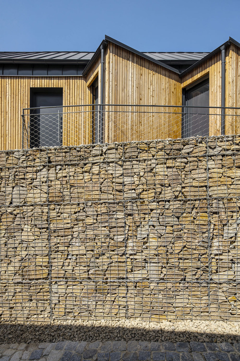 Například velkorysým proskleným průčelím nebo vyosenými ‚střílnami‘ v ložnicích. Je to takový nenápadný rebel.“ Ani přízemní část z tvárnic nepatří mezi obvyklá řešení. Slouží jako zázemí domu a sklep, proto autoři zvolili poměrně syrovou formu. V kontrastu k němu je patro ze dřeva, na prosklené průčelí navazuje krásná terasa, obrácená k jihozápadu. Z jedné strany ji rámuje gabionové zdivo, kovové zábradlí je lehké, jednoduché. Proti původnímu projektu nebyla dokončena pergola s ocelovou nosnou konstrukcí. Měla tvar průčelí se štítem, takže by celkový výraz domu doplnila.