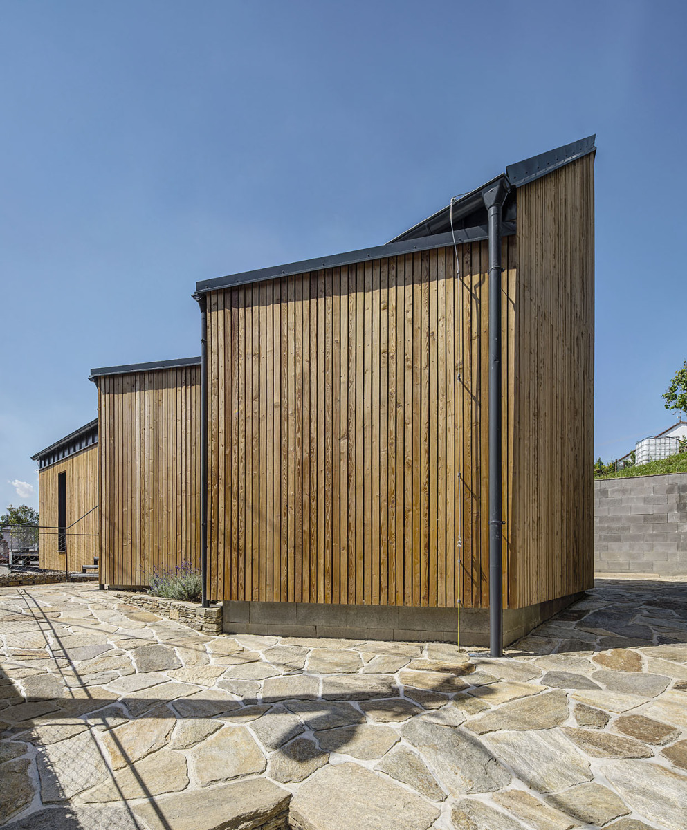 Když k domu v Miroslavi přijdete, uvidíte stěny z tvárnic, gabionové zdivo, v patře dřevěnou fasádu a velké prosklení ve štítu s terasou. Řeknete si, to opravdu není moravský venkov. Ale při pohledu z dálky dům do obce dokonale zapadá, stal se její součástí. Snad i proto, že autoři vytvořili spíše drobnou stavbu se sedlovou střechou. Možná se také trochu inspirovali japonskou architekturou, která je často vertikální, umí dobře hospodařit s prostorem a co nejlépe využívá světlo i výhledy.