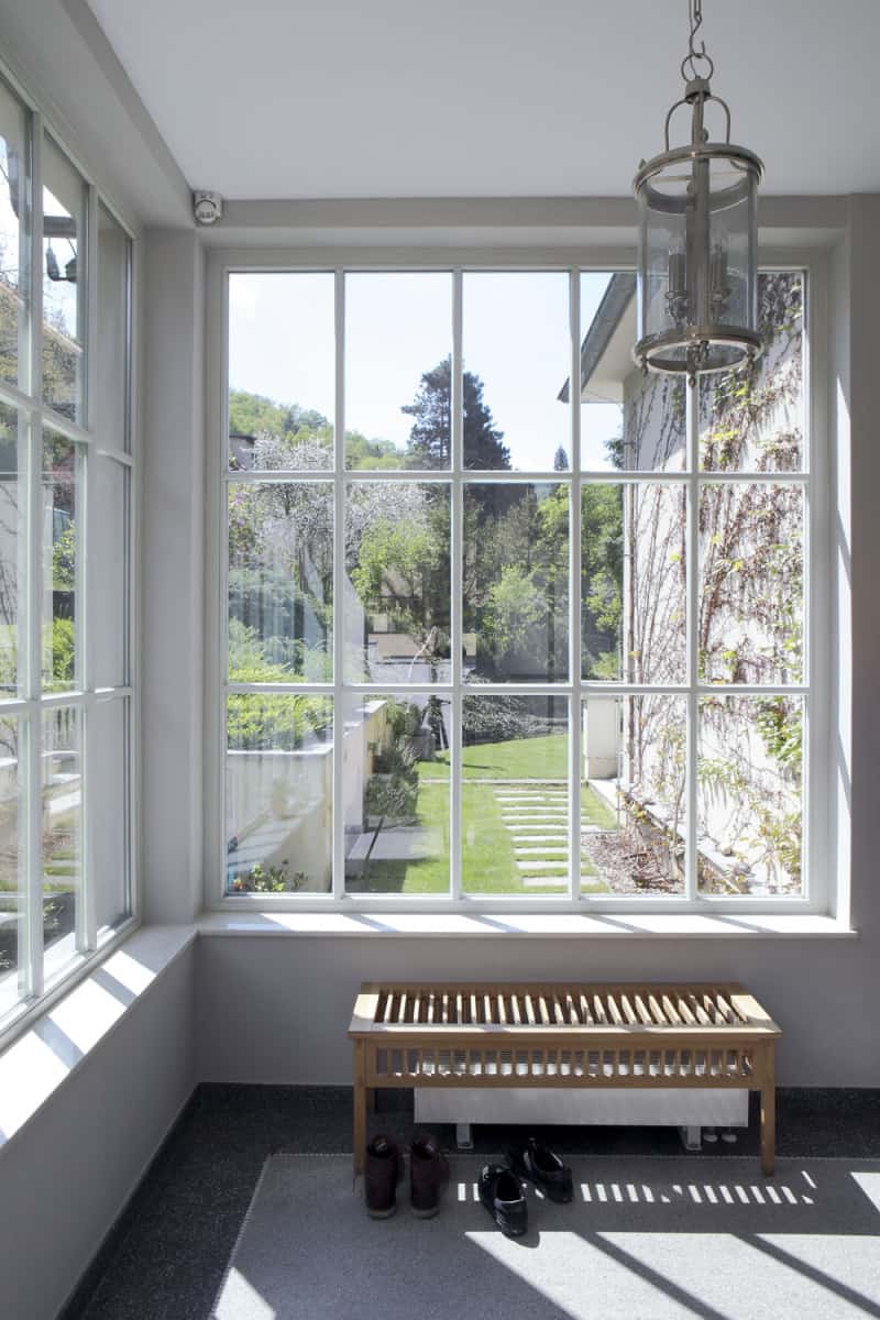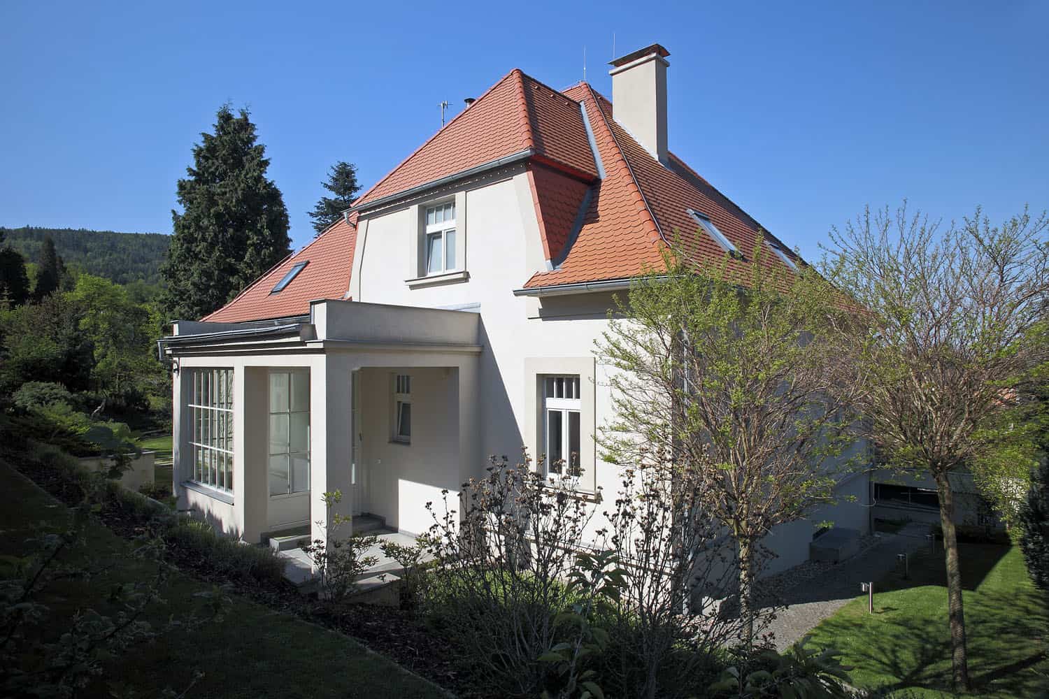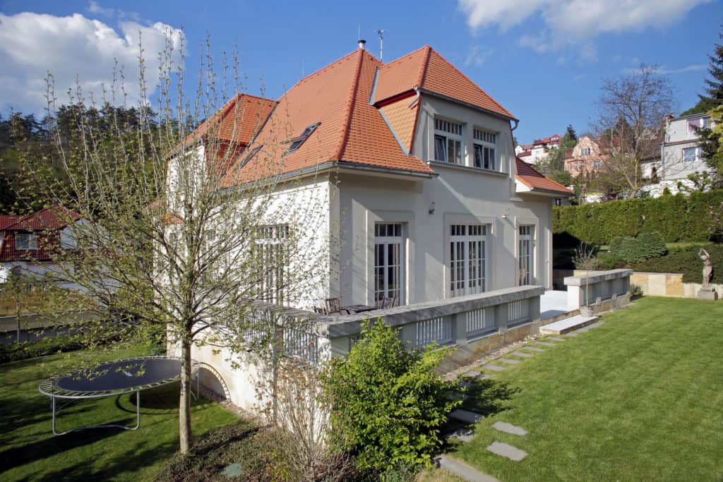 Noblesní vila z dvacátých let na sebe z ulice nijak neupozorňuje. Je totiž situována ve svahu, kde perspektiva střech vystupujících ze zeleně vytváří dokonalé mimikry. Za zídkou se však skrývá velkoryse zrekonstruovaná stavba, jejíž adresa snese srovnání s prémiovým bydlením v dosahu Prahy.
