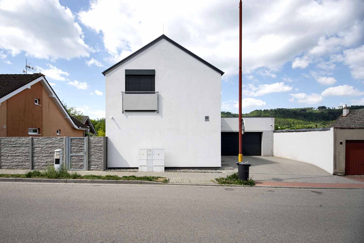 Návrh nového domu respektuje charakter okolní zástavby, kterou tvoří převážně jednopodlažní a dvoupodlažní domy s obytným podkrovím. Novostavba je umístěna při horní hranici pozemku a posunuta o 60 cm od linie uliční čáry, aby zde bylo možné vybudovat novou rozvodnou skříň a instalační šachtu. Velkou výhodou bylo, že původní dům přímo sousedil s vedlejším domem na severozápadní straně, bylo tedy možné „jít“ až na tuto hranici pozemku. Nachází se zde zpevněná plocha s přímým vjezdem z ulice a zděná garáž s plochou střechou pro dva automobily. Vzniklý „záliv“ slouží k parkování a jako nástupní plocha do domu.