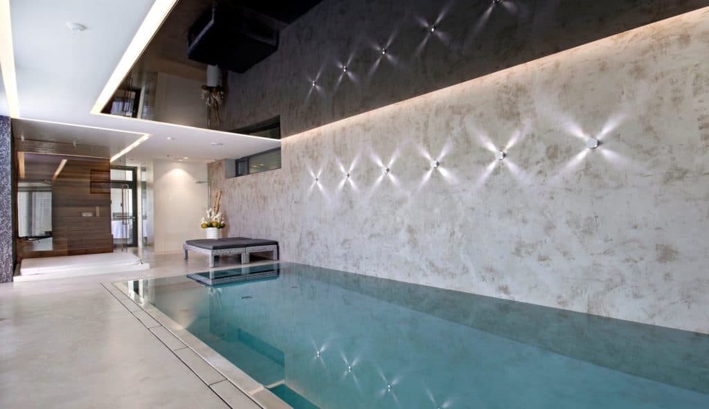 Hladké vodě odolné stěrky jsou ideálním povrchem na stěny a podlahy do bazénové haly, a to z praktických i estetických důvodů (rodinný dům v Brně, Němec – luxusní povrchy)