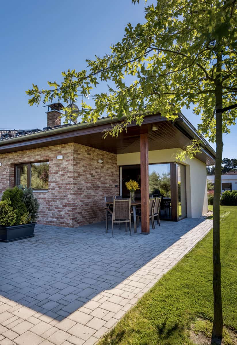 Vzhledem k tomu, že už mají odrostlé děti, nepotřebovali veliký dům s mnoha pokoji. S výhledem na budoucnost si chtěli ale postavit bezbariérový dům s pokojem pro návštěvy dětí a vnoučat. „Nechtěli jsme velké místnosti, je to pak takové neútulné. Rozměry domu nám takhle naprosto vyhovují,“ říká naše hostitelka. Kamarádka jí dala tip na pražskou stavební firmu STINGS 96, kam už šli s představou o stavbě vysněného bungalovu. Architektonická studie i projekt pak vznikly ve spolupráci s touto firmou.