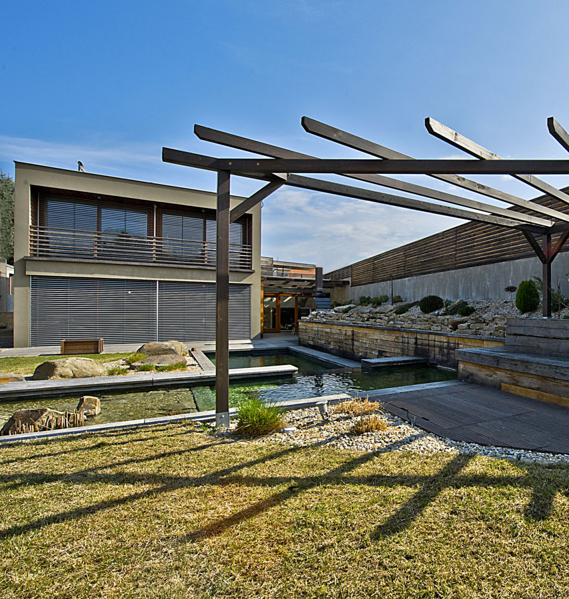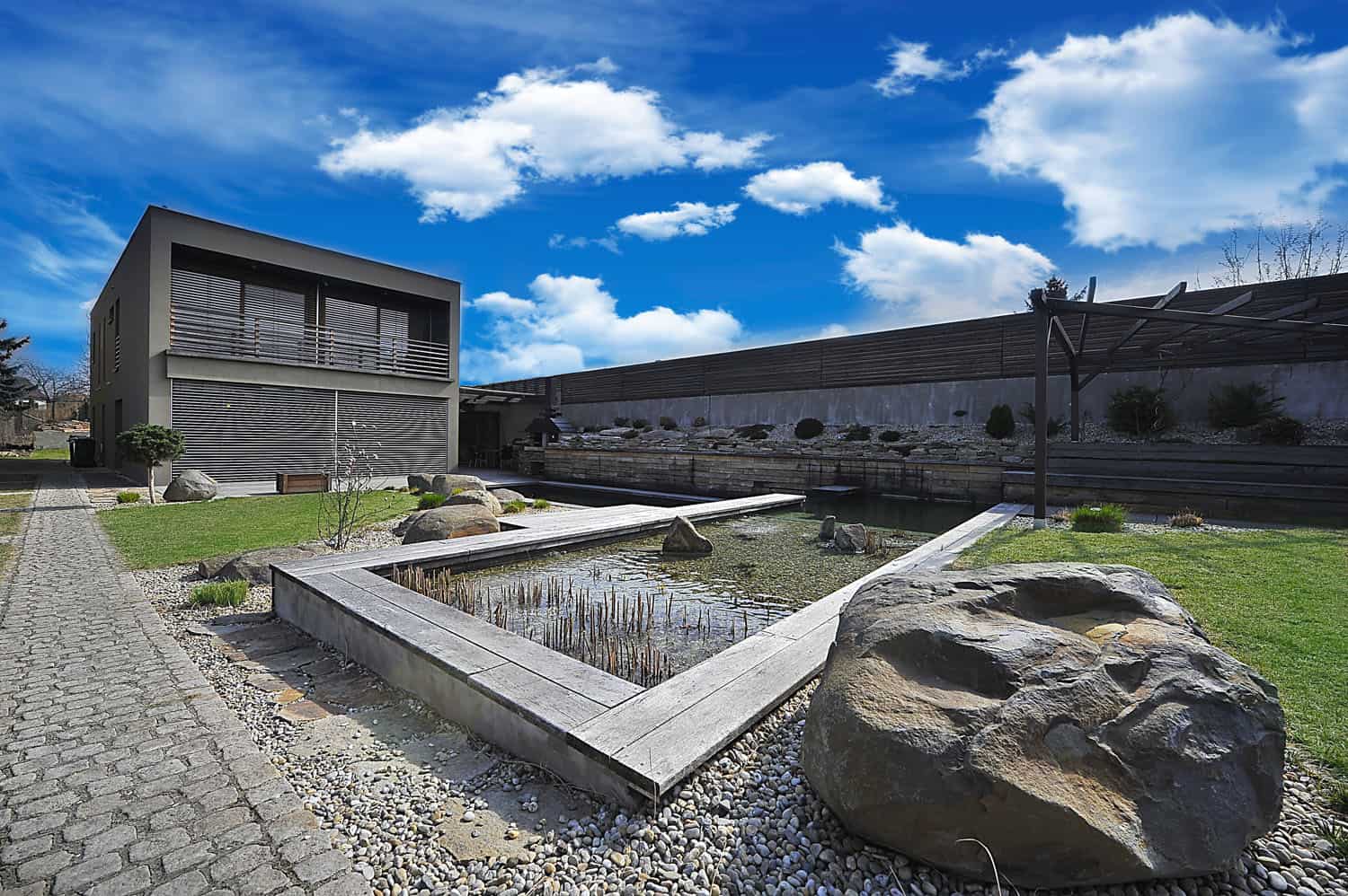 Dům s jezírkem a upravenou zahradou nestojí v rezidenční čtvrti v teplých krajích, jak některé fotografie klamně napovídají, ale v malé obci na Moravě, která se ničím neodlišuje od běžného obrazu našich vesnic. Na původně nehostinném pozemku architekti spolu s rodinou vytvořili mikrosvět plný pohody.