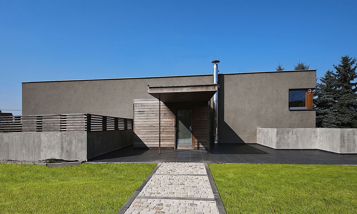 Na protáhlém úzkém pozemku v malé obci, lemovaném ze tří stran komunikacemi a „utopeném“ pod bývalou hrází mlýna, si na první pohled málokdo dokázal představit stavbu rodinného domu. 80 m dlouhá parcela, orientovaná směrem severovýchod – jihozápad, se navíc směrem ke kratším stranám zužuje a ve střední části, kde jedině bylo možné dům umístit, dosahuje výškový rozdíl mezi úrovní pozemku a přístupové komunikace přes 2 m.