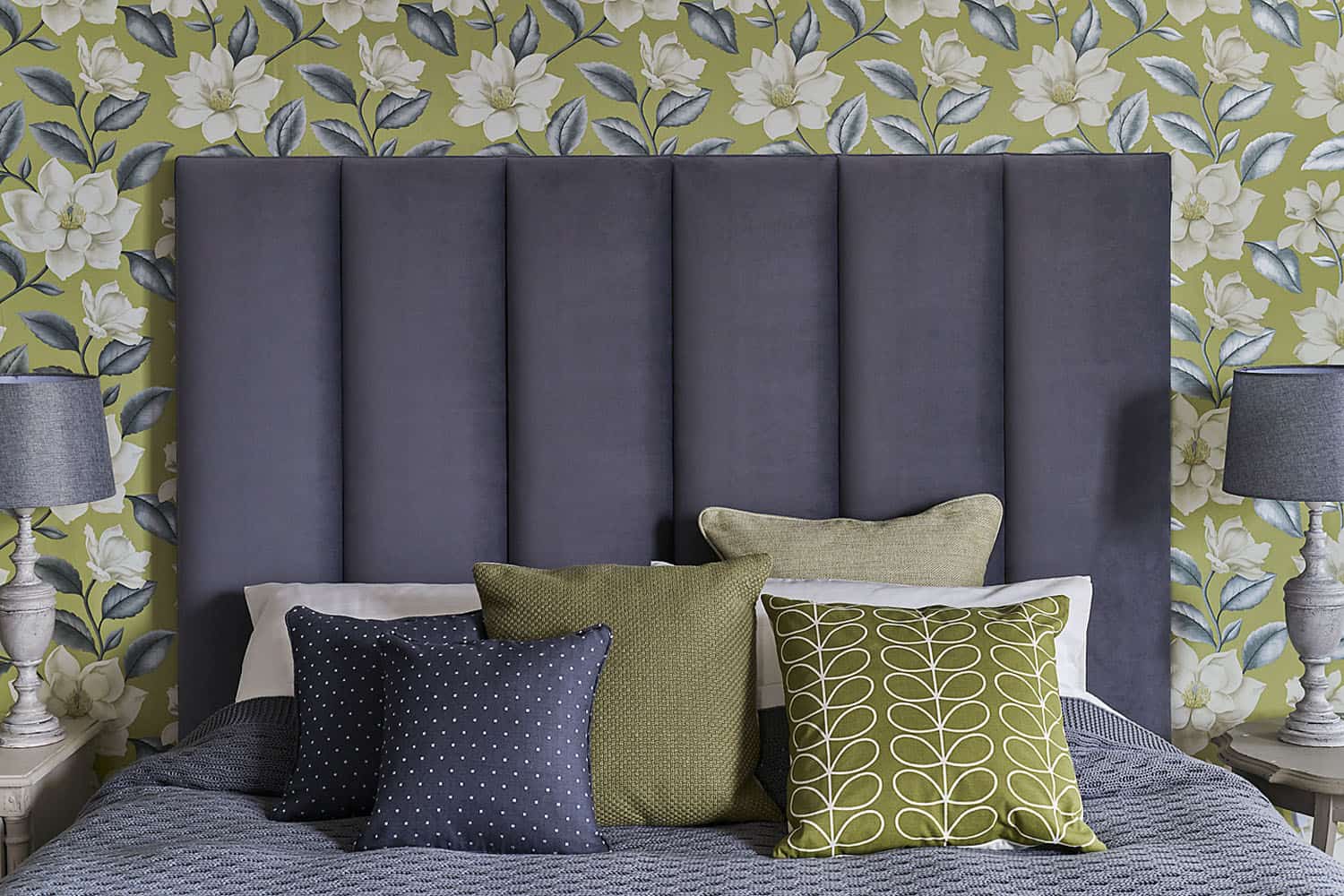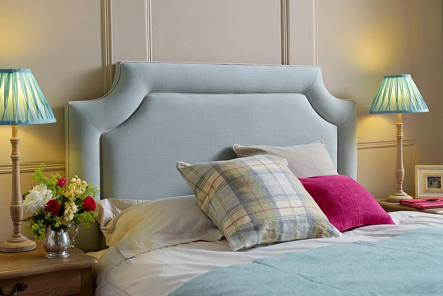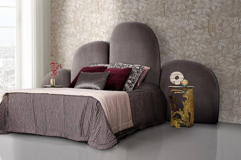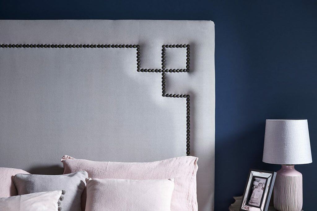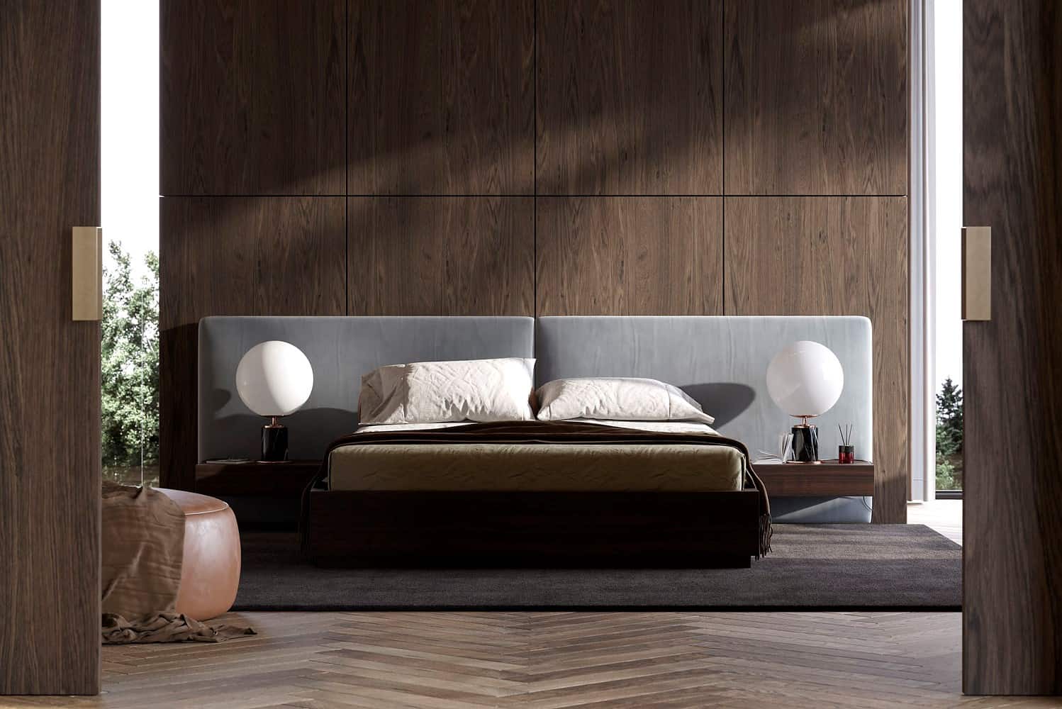Čelo může být širší než samotné lůžko. Může být na celou šířku nočních stolků nebo i od stěny ke stěně, dle velikosti ložnice. V tomto případě je ideální volit hladké čalounění a jednoduchý obdélníkový tvar. Foto: Laskasas
