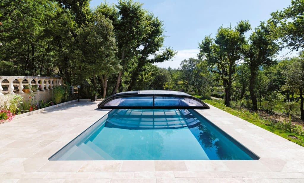 K vyšší teplotě vody v bazénu a tím pádem i k prodloužení koupací sezony v bazénu výrazně přispěje kvalitní bazénové zastřešení a vhodně zvolený zdroj ohřevu (DESJOYAUX)
