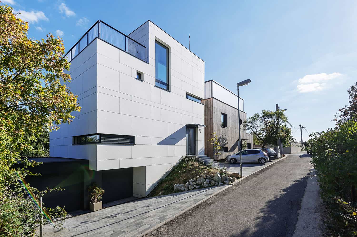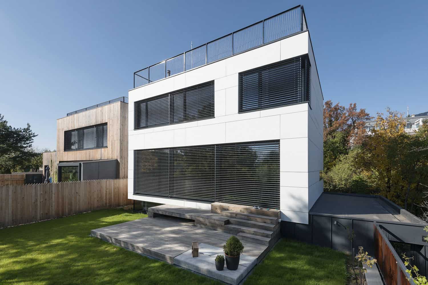 Architekti Matej Grébert a Juraj Benetin z bratislavského ateliéru Compass Architekti stáli před úkolem navrhnout bydlení pro dvě rodiny na pozemku u lesa s krásným výhledem na Bratislavu. Zdánlivě ideální zadání, jaké by si každý architekt mohl jen přát, ale celková velikost parcely pouhých 660 m2 a různý životní styl a vkus obou rodin znamenaly velkou výzvu.