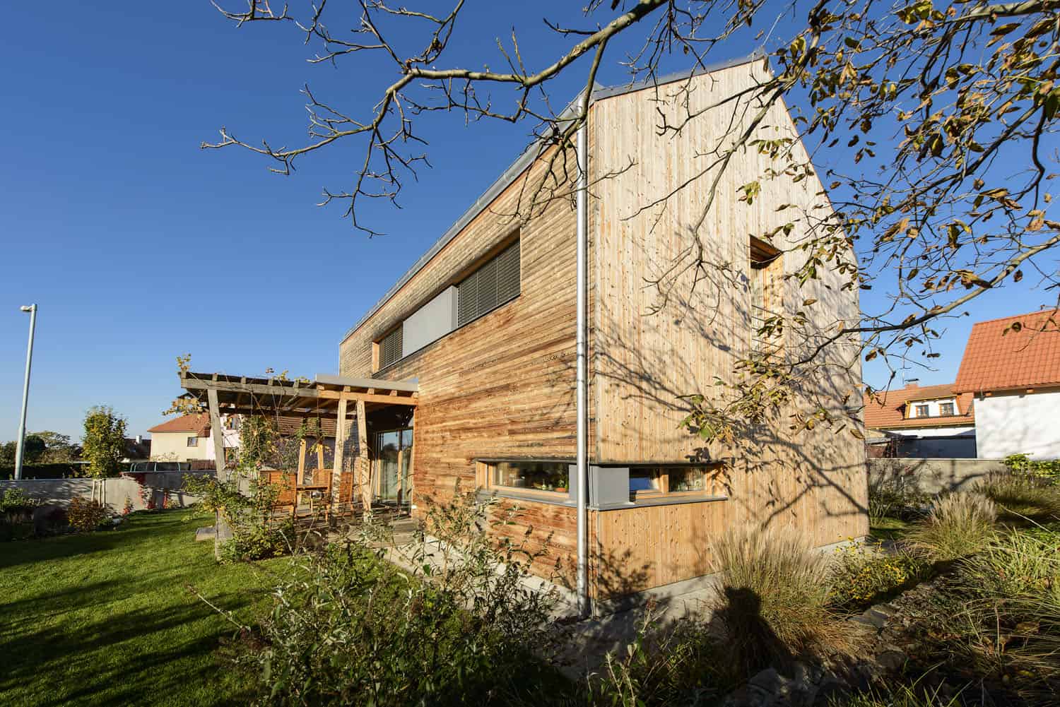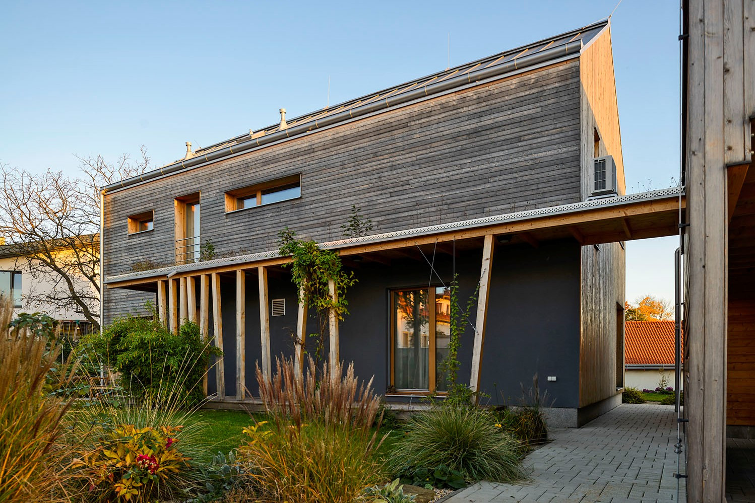 Architektka Jana Jasinek navíc tuto hru s hmotami, vertikalitou a horizontalitou znásobila řešením fasád. Podélné plochy jsou obložené palubkami kladenými vodorovně, zatímco štítové stěny jsou obloženy palubkami ve svislém směru.
