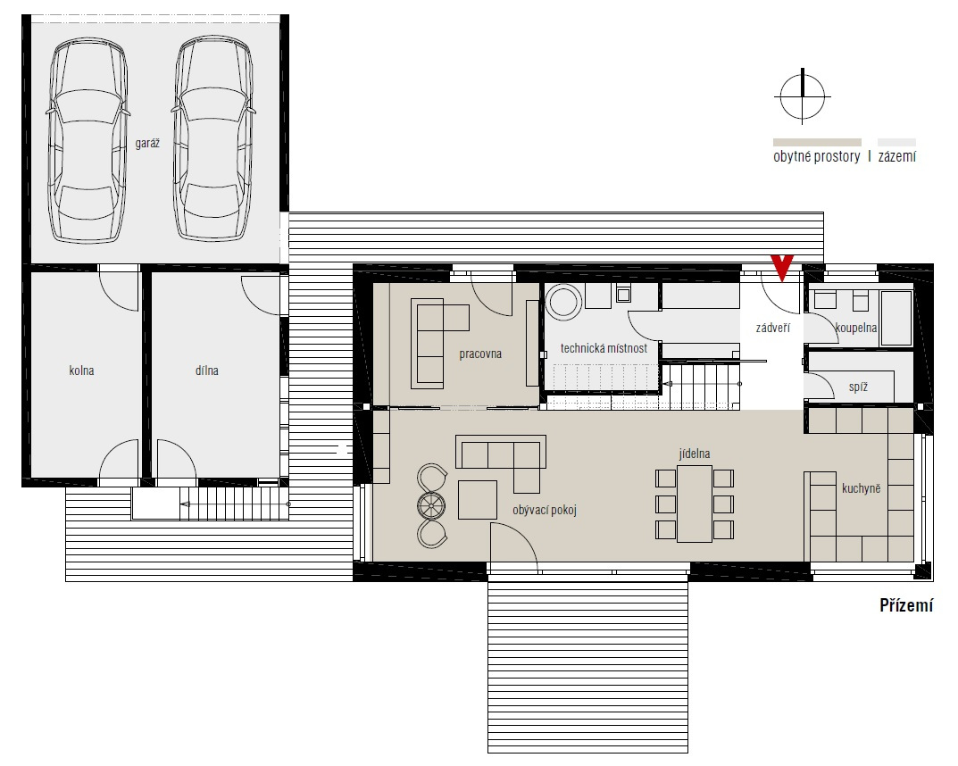 Druhá budova zahrnuje prostory bez zvláštních nároků na tepelnou izolaci, a proto mohla být navržena jako klasická sloupková dřevostavba. „Co nemusí být v zateplené obálce domu, je lepší umístit mimo, což vyjde levněji, stejně jako sdružení do jednoho celku místo několika,budek‘ rozložených na pozemku,“ doplňuje Jana Jasinek.