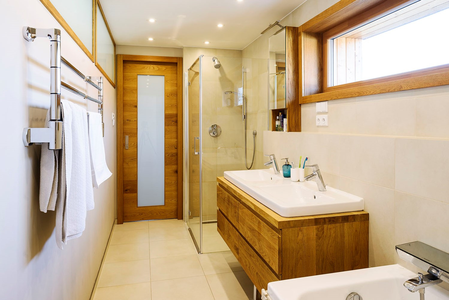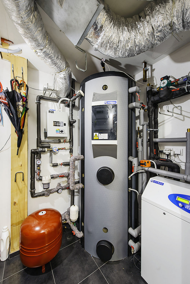 Dům je vybaven centrálním řízeným větráním s rekuperací tepla. Vzduchotechnika se využívá i k vytápění, na požadovanou teplotu se vzduch předehřívá vodou ohřátou tepelným čerpadlem. Jedním systémem se tedy větrá, topí, případně i chladí. „Raději se vyhýbáme teplovodnímu podlahovému topení, jednak proto, že podlaha v pasivním domě je pocitově sama o sobě dost teplá, a také proto, že to znamená zbytečně moc vody v podlaze. Voda je vždy ošemetný element, proto se snažíme nevést ani vodovodní trubky podlahou, ale stěnami nebo stropem. V podlaze může i malá netěsnost unikat dlouho pozornosti,“ upřesňuje architektka.