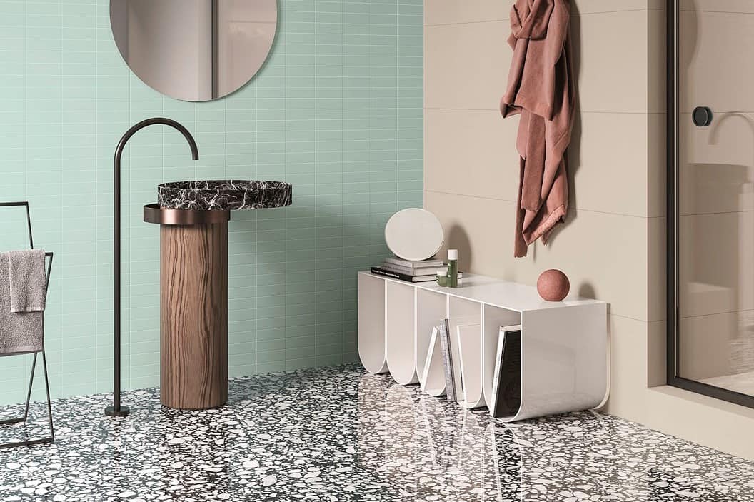 V koupelně je hlavním hlediskem pro výběr podlahy odolnost proti vlhkosti a vodě, saponátům a také protiskluzový povrch. Tato kritéria jednoznačně hovoří pro keramickou dlažbu, která nabízí velkou tvrdost, vysokou odolnost proti mechanickému opotřebení, chemikáliím, dlouhou životnost a rozmanitou nabídku dekorů od imitace různých druhů přírodního kamene přes beton až po napodobení podlahy z dřevěných prken, včetně spárování, barevnosti a textury povrchu. Keramika je také vzhledem k tepelněakumulačním schopnostem vhodná pro stále oblíbenější podlahové vytápění, jediným argumentem proti může být pracnost pokládky a potřeba spárování.
