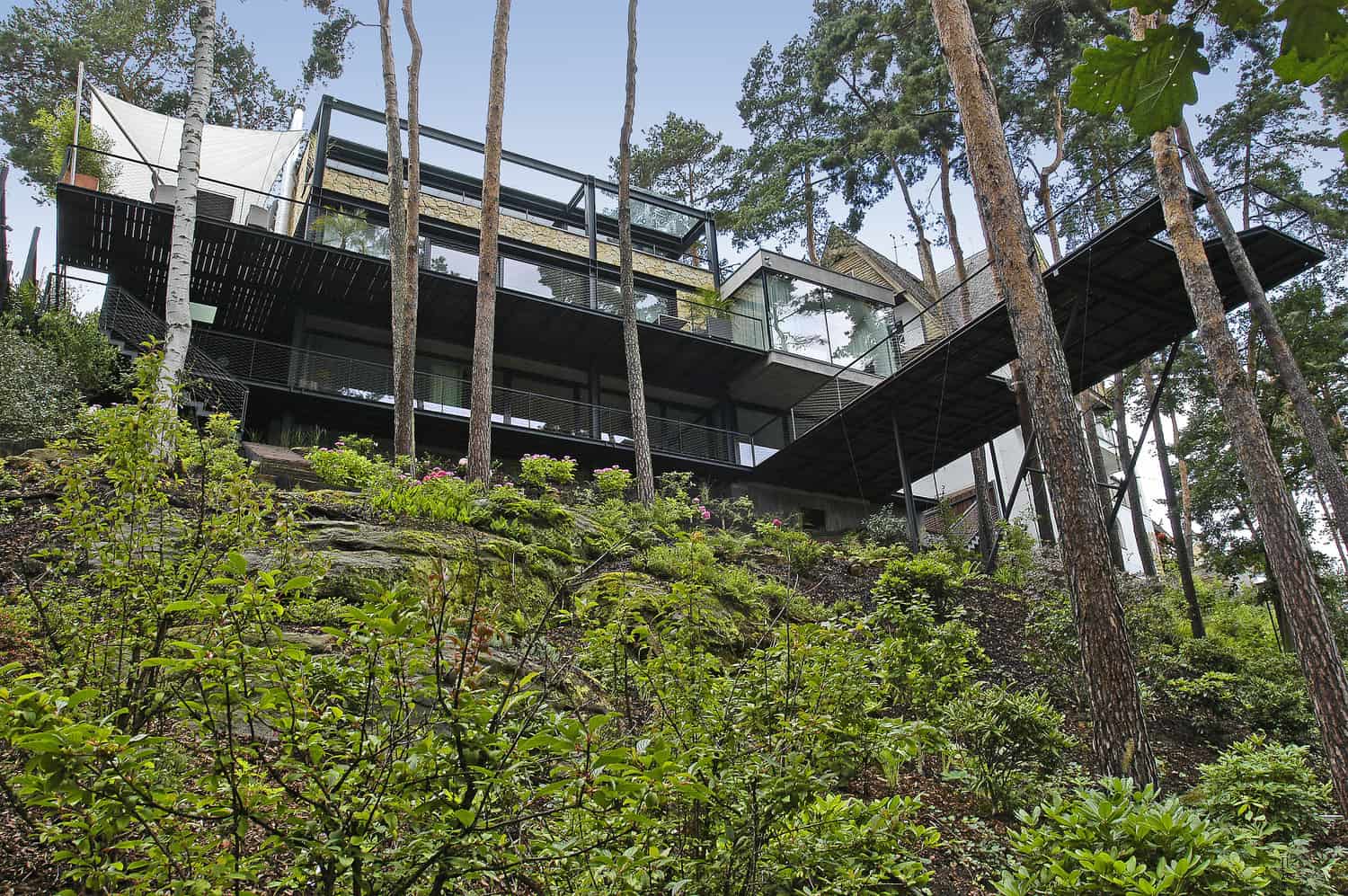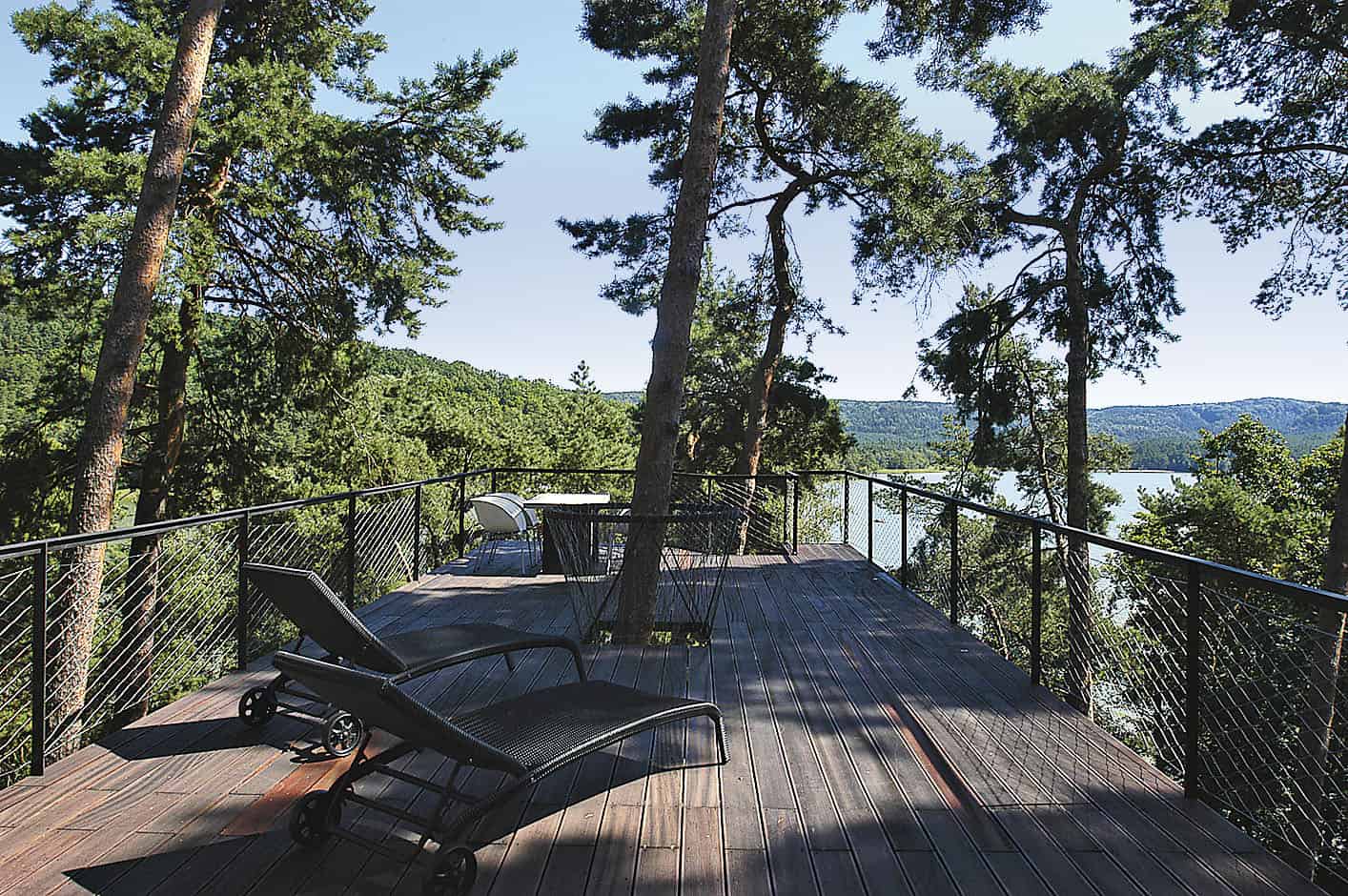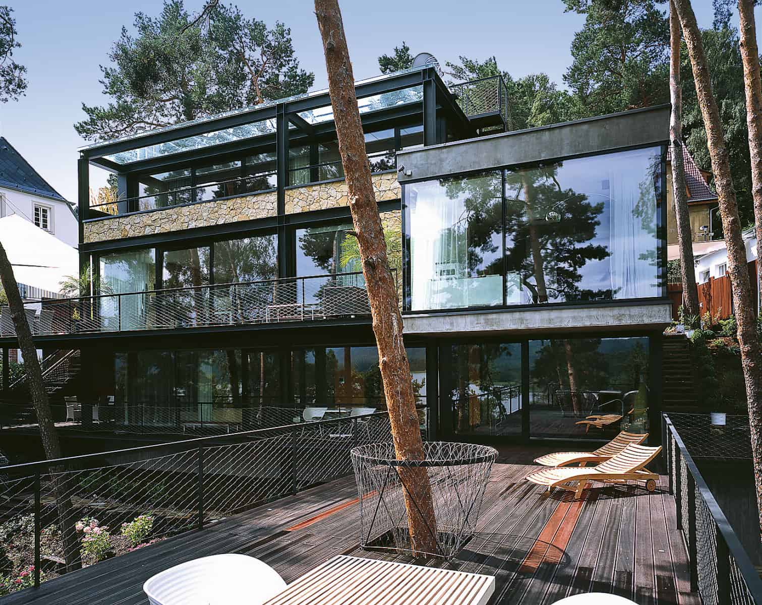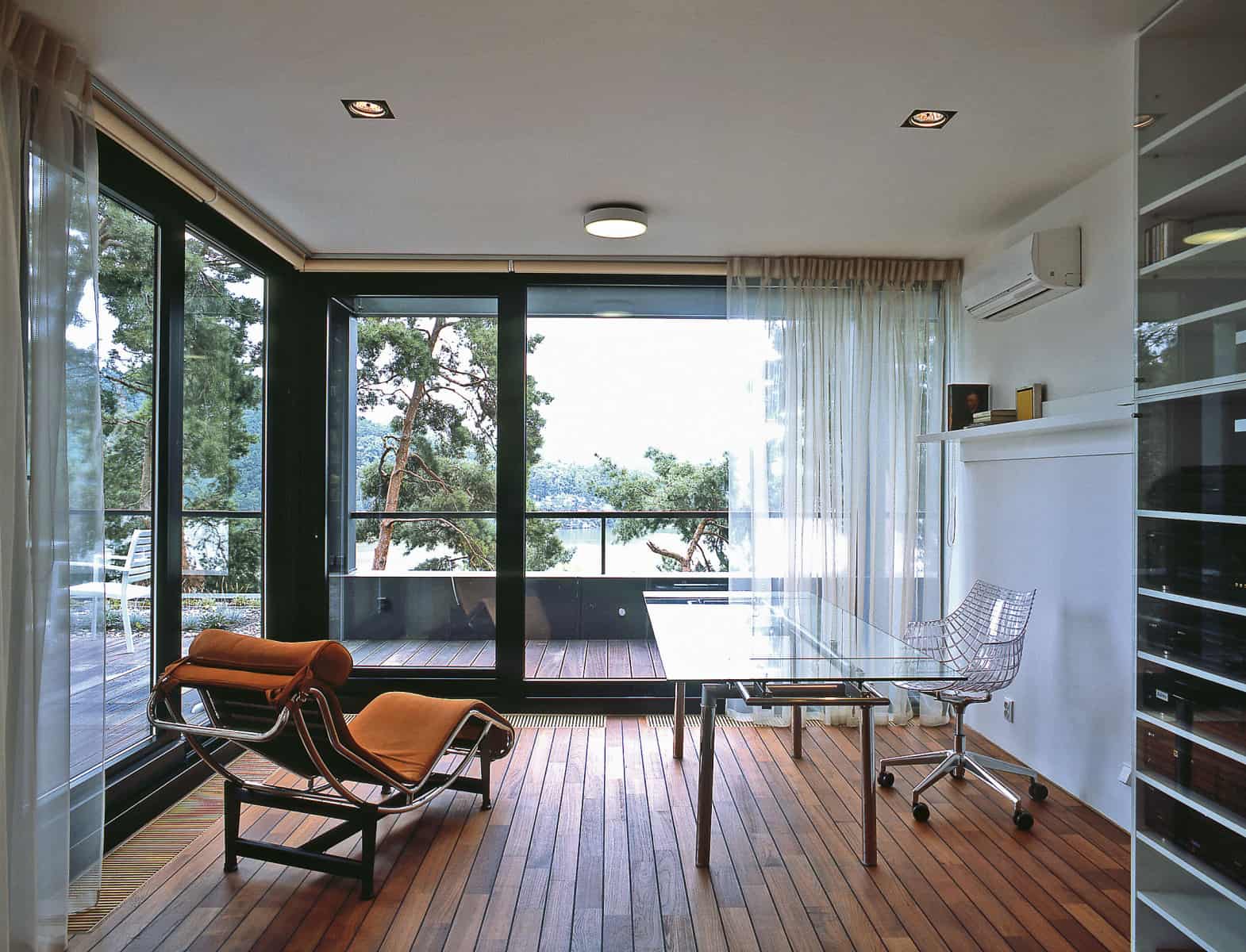 Nevtíravou architekturu, která citlivě vrůstá do přírody, místo aby ji pyšně opanovala, známe z Japonska nebo ze Skandinávie, v našich končinách je spíše popelkou. Svažitý pozemek, kde vládne mihotavý kontrast slunečních paprsků a stínů starých jehličnanů a v tichu mezi stromy září diamantové záblesky vodní hladiny, si zasloužil jedinečný přístup architekta i stavebníka.