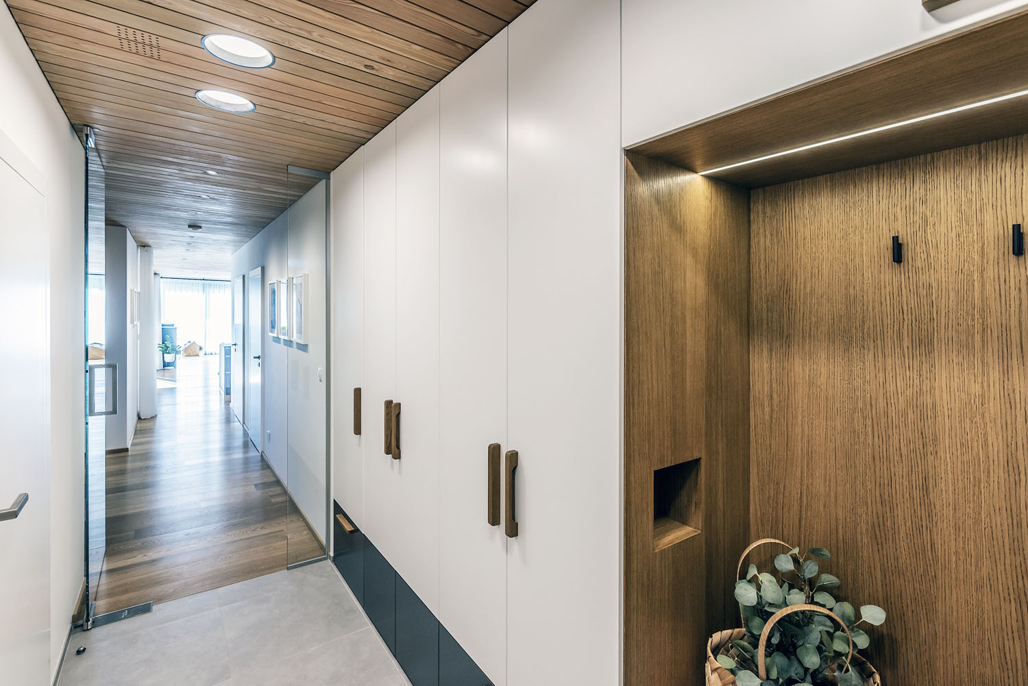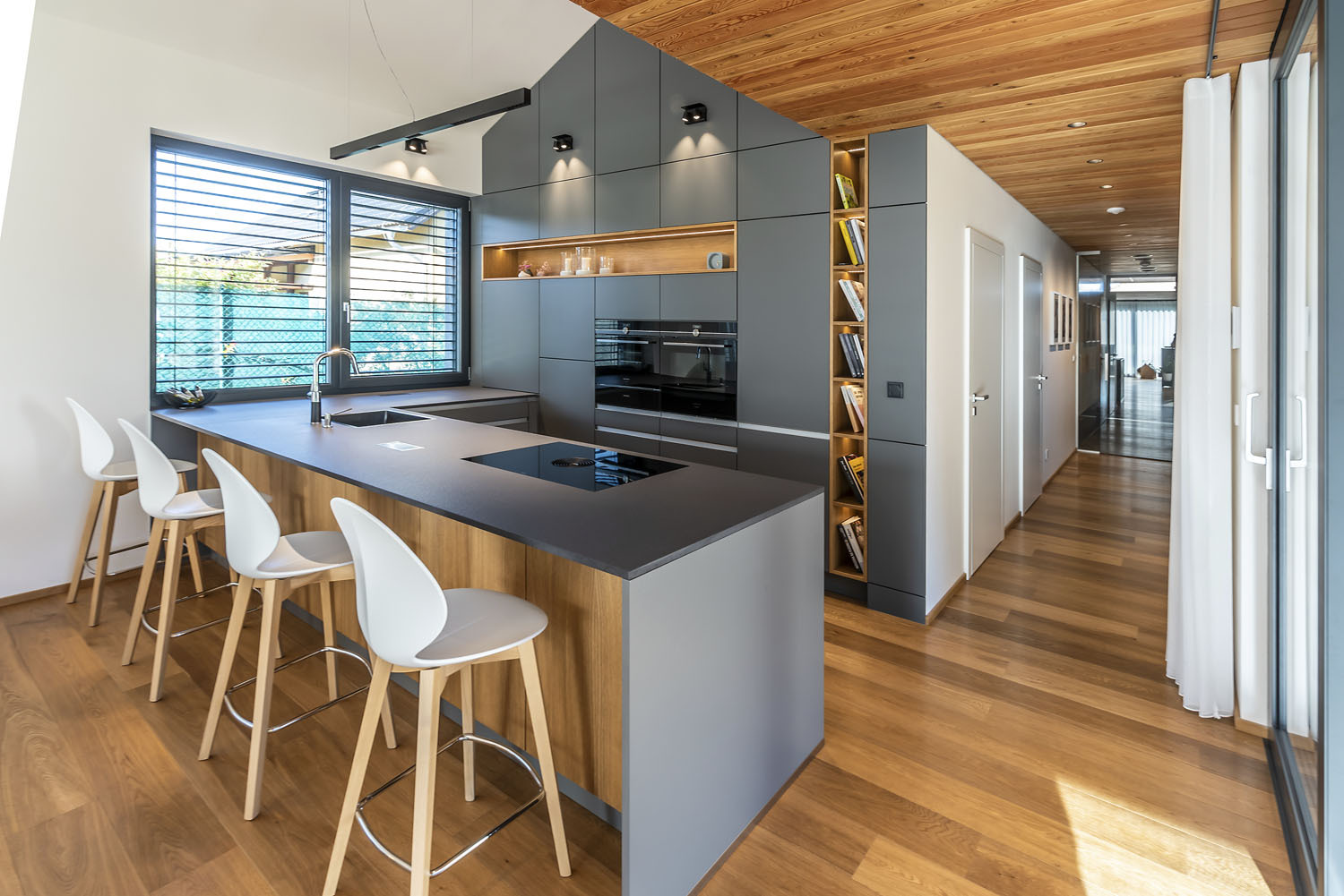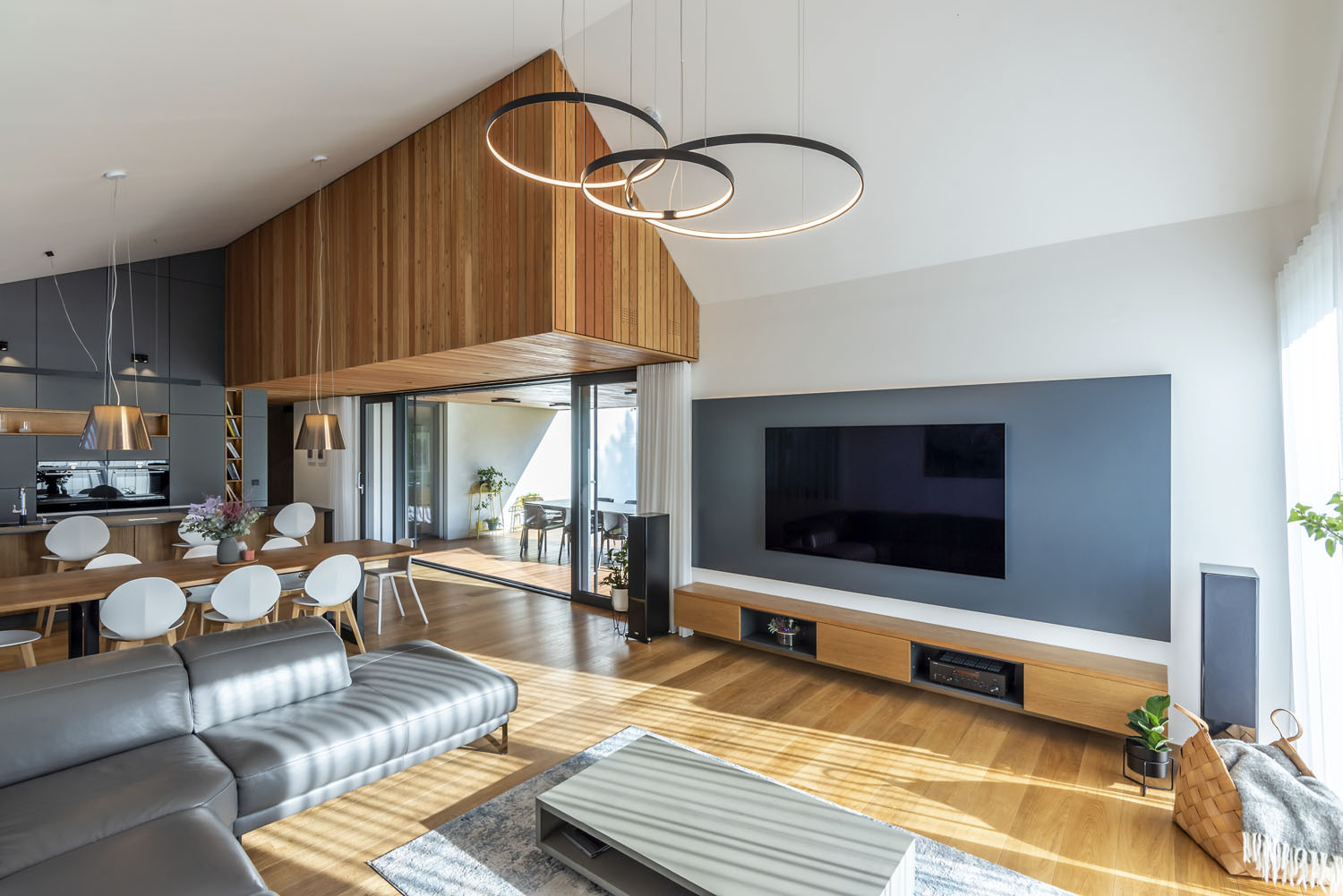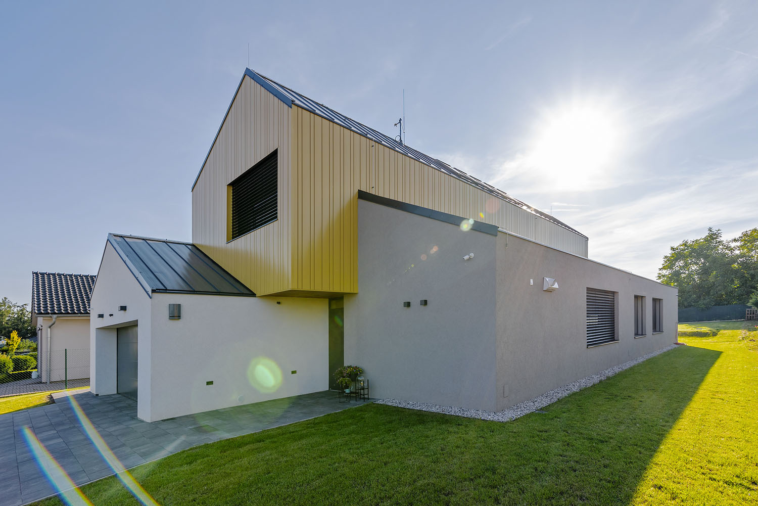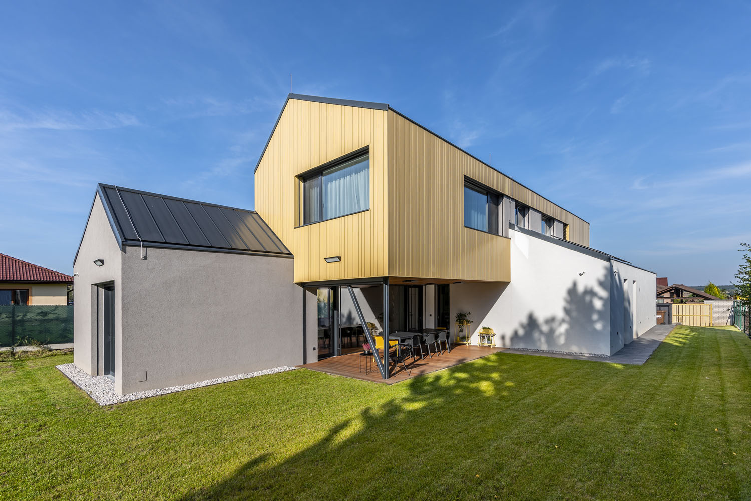 Sestava tří hmot se sedlovými střechami, které vzájemně srůstají v útvar pro rodinné domy značně netypický, působí na první pohled, jako by si děti hrály se stavebnicí. Ve skutečnosti tu je všechno do puntíku promyšlené.