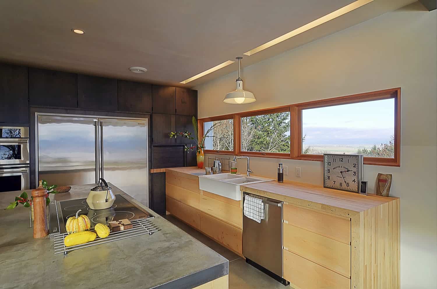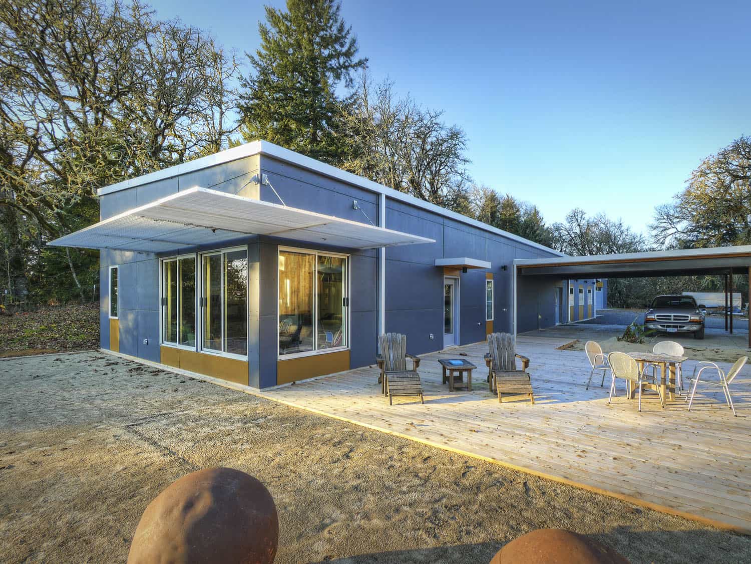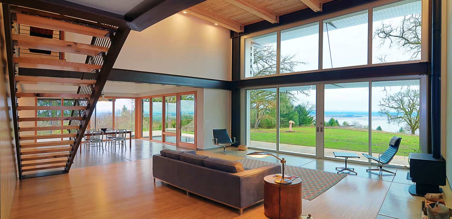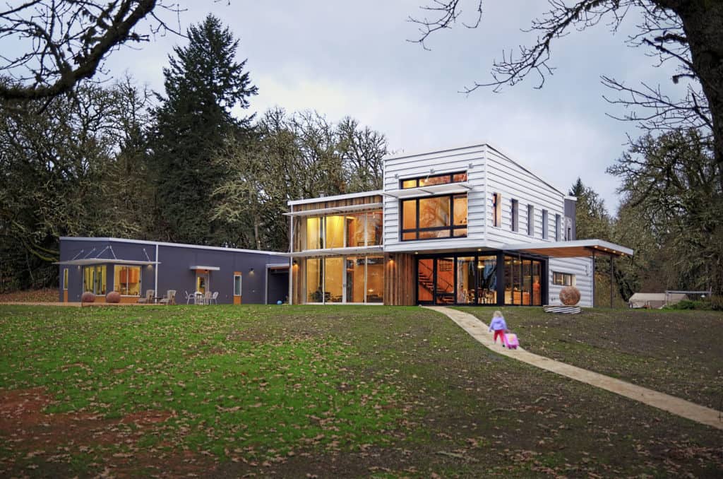 Rozlehlý pozemek u jezera Fern Ridge Lake v americkém státě Oregon byl pro architekty i majitele výzvou i inspirací, jak vybudovat moderní bydlení v co největším souladu s přírodou. Neomezili se na standardní pasivní dřevostavbu, která se zde nabízela, ale dospěli k originálnímu řešení s využitím recyklovaných materiálů.