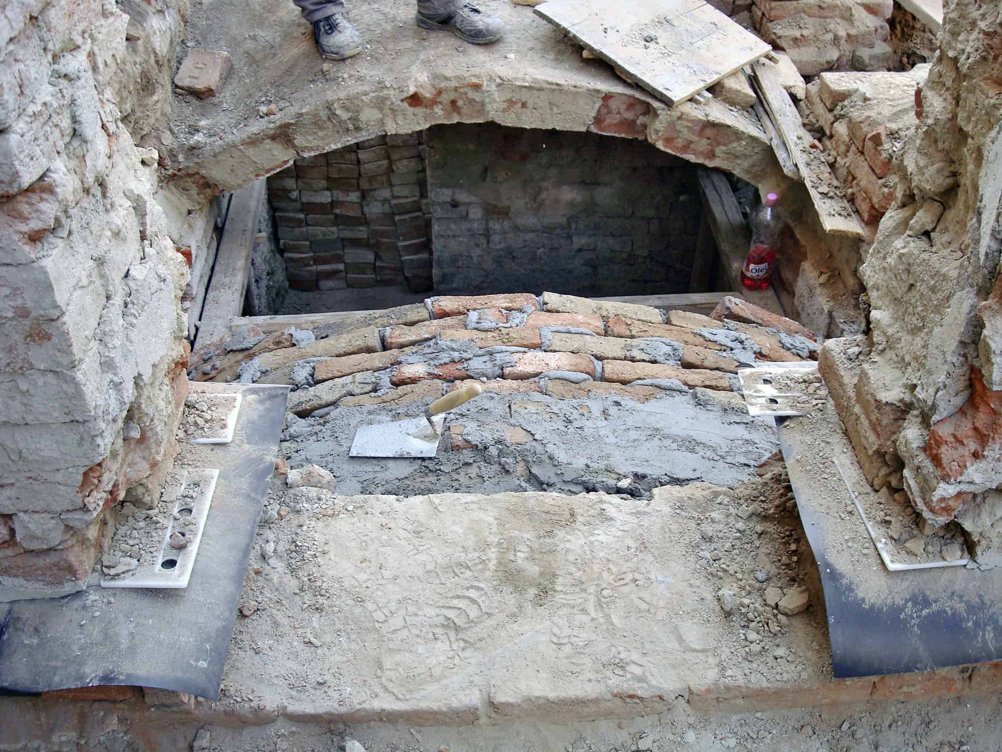 Předně bylo potřeba zabránit vzlínání vlhkosti ve stávajícím zdivu. Rozhodli jsme se pro bezpečné řešení – celkové podřezání všech stěn a následné vložení hydroizolace z HDPE fólie. Řez byl veden ložnou spárou cihelného zdiva, což sice zjednodušilo práci, později to ale zkomplikovalo napojování horizontální hydroizolace. Spára totiž nebyla v jedné rovině, a tak se místy dostala vysoko a místy zase příliš nízko, až pod úroveň základové desky.