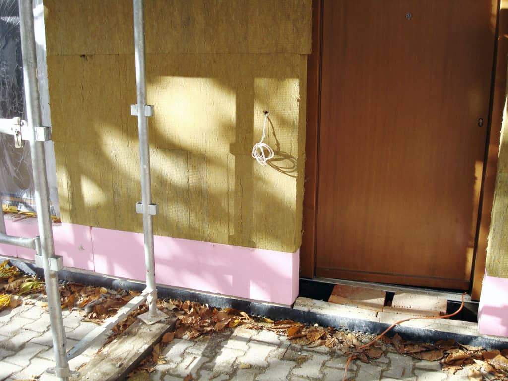 Napojování jednotlivých vrstev tepelné izolace. I venkovní schod je tepelně oddělen – byla zde vynechána kapsa pro izolant
