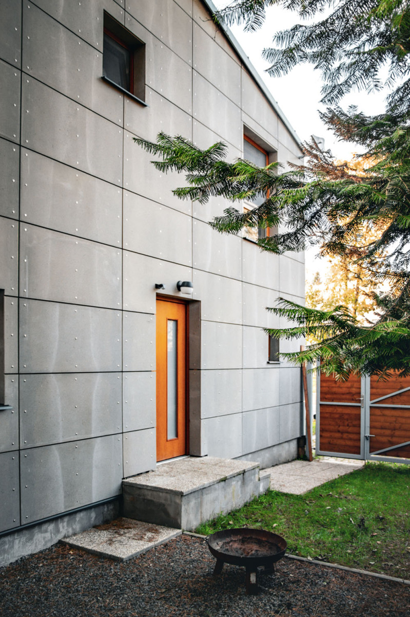 Řešení působí velkoryse a důmyslně. Velké okno na terasu propojuje denní část v přízemí s intimní zahradou, uzavřenou zčásti dřevěným, zčásti živým plotem, který si rodina hýčká již od doby projektování. Menší okna v ložnicích a v koupelně na galeriích, propojených dvouramenným schodištěm, umožňují výhledy do okolí a do korun vzrostlých borovic.