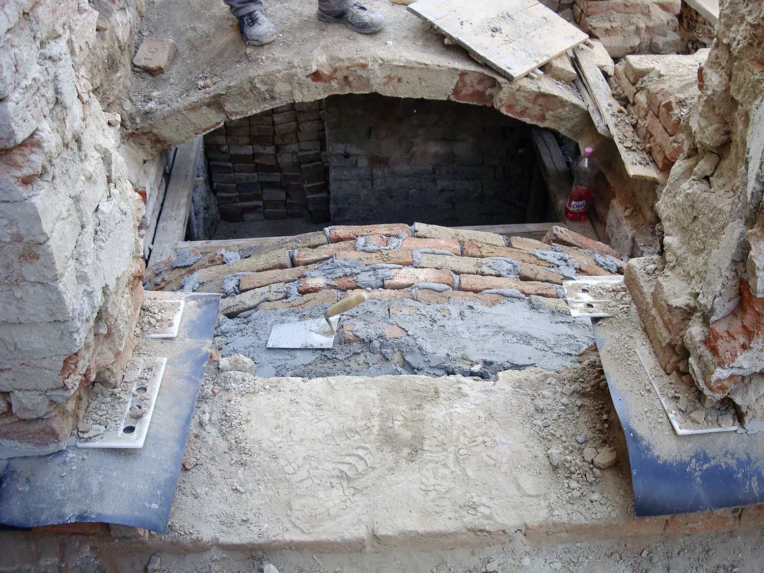 Předně bylo potřeba zabránit vzlínání vlhkosti ve stávajícím zdivu. Rozhodli jsme se pro bezpečné řešení – celkové podřezání všech stěn a následné vložení hydroizolace z HDPE fólie. Řez byl vedený ložnou spárou cihelného zdiva, což sice zjednodušilo práci, později to ale zkomplikovalo napojování horizontální hydroizolace. Spára totiž nebyla v jedné rovině, a tak se místy dostala vysoko a místy zase příliš nízko, až pod úroveň základové desky.