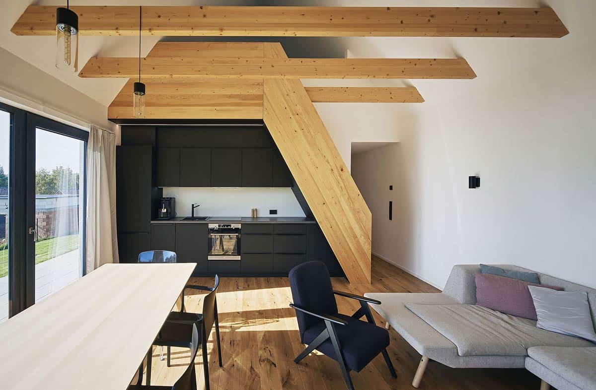 Návrh respektuje měřítko a ráz okolní zástavby. Dům je orientován v souladu s venkovskou urbanistickou tradicí podélnou osou kolmo k ulici. Místo obvyklého stavení obdélníkového tvaru se sedlovou střechou se na nás však z ulice „dívají“ štíty dva. „Dům se skládá ze dvou archetypálních hmot se sedlovou střechou o sklonu 50°, které jsou vůči sobě posunuté a uvnitř propojené vnitřní chodbou. Každá hmota plní rozdílnou funkci, obytnou a nebytovou,“ vysvětluje architekt Jan A. Řezáč, autor návrhu.