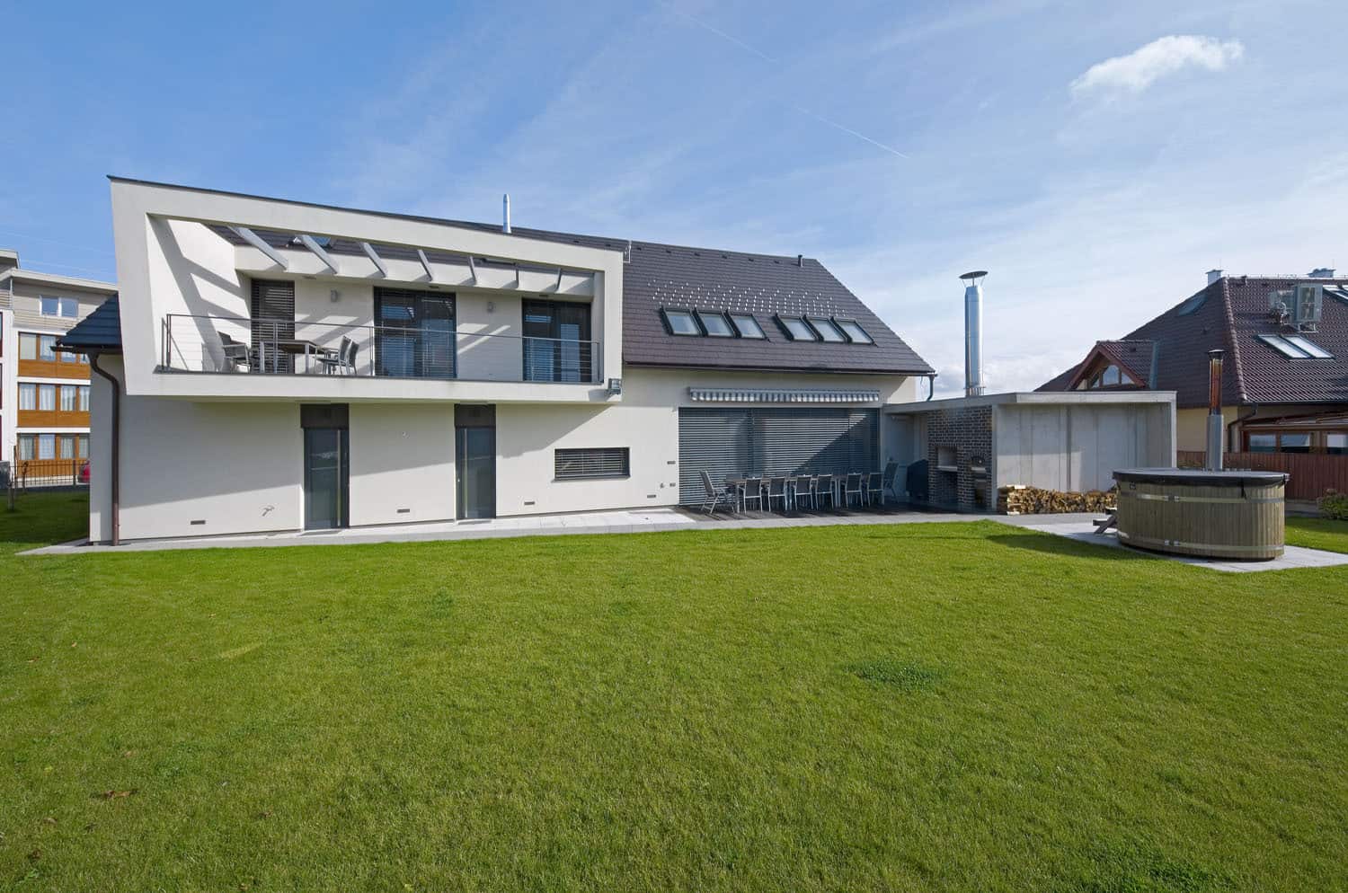 Na rozsáhlé parcele s řadovými domy se podařilo prosadit individuální stavbu moderního dvougeneračního domu, který plně respektuje okolní zástavbu i orientaci pozemku.