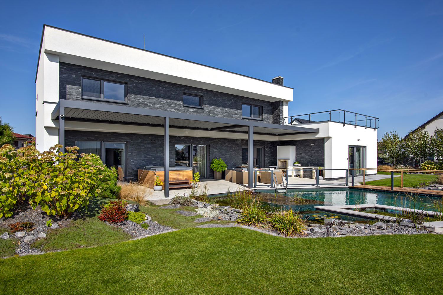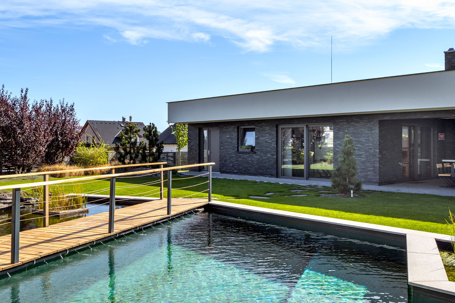 Na první pohled působí dům funkcionalistickým dojmem, který nezapře ani následná prohlídka interiéru. Na pozemcích, kde stojí současná moderní zástavba, bylo podle územního plánu města povoleno stavět domy pouze se sedlovou střechou. Až na tři parcely, které dostaly výjimku a kde bylo možné pro zpestření lokality stavět alternativní domy s plochou střechou. Limit pro zastavěnou plochu na této konkrétní parcele činil 300 m2 včetně garáže. Původní myšlenkou bylo postavit bungalov, který bude mít různé výšky stropu, aby interiér nepůsobil všedním dojmem. V průběhu prvních náčrtů dispozic však bylo jasné, že svažitý pozemek jde využít zajímavějším způsobem. Takže k základním požadavkům rodiny se postupně přidávaly další místnosti, jako například relaxační prostor, pracovna, dva dětské pokoje místo jednoho a také pokoj pro hosty včetně vlastní koupelny. Výsledkem týmové spolupráce s projektantem je zajímavým způsobem členitý dům se třemi podlahovými úrovněmi. Což společně s plochou střechou zapadalo přesně do představ majitele.
