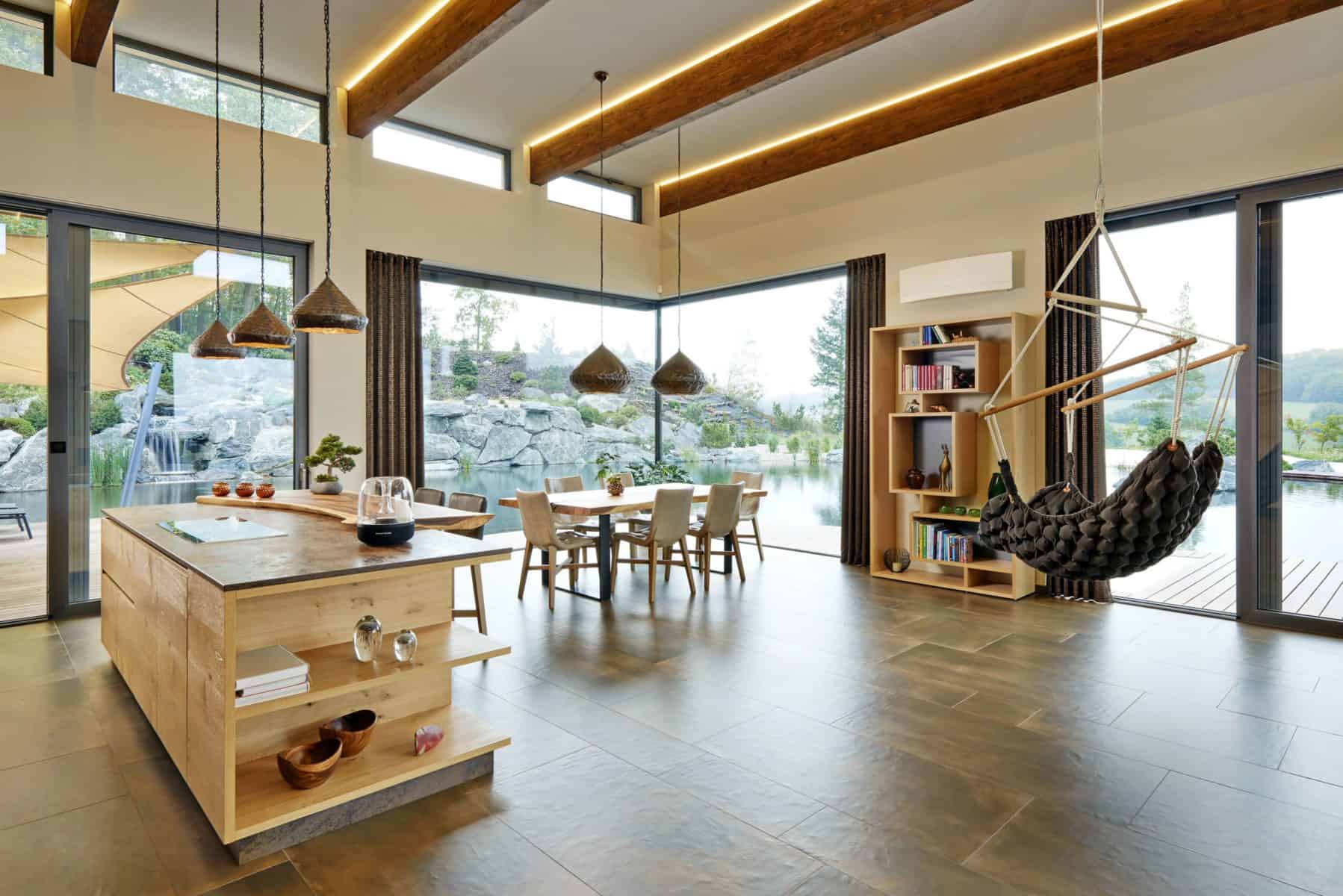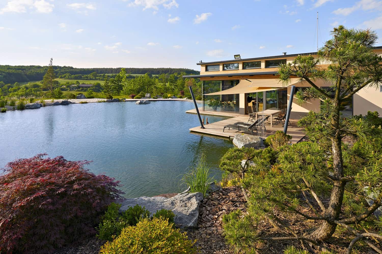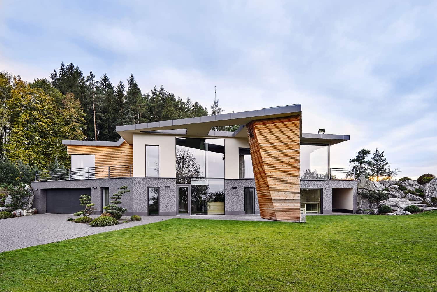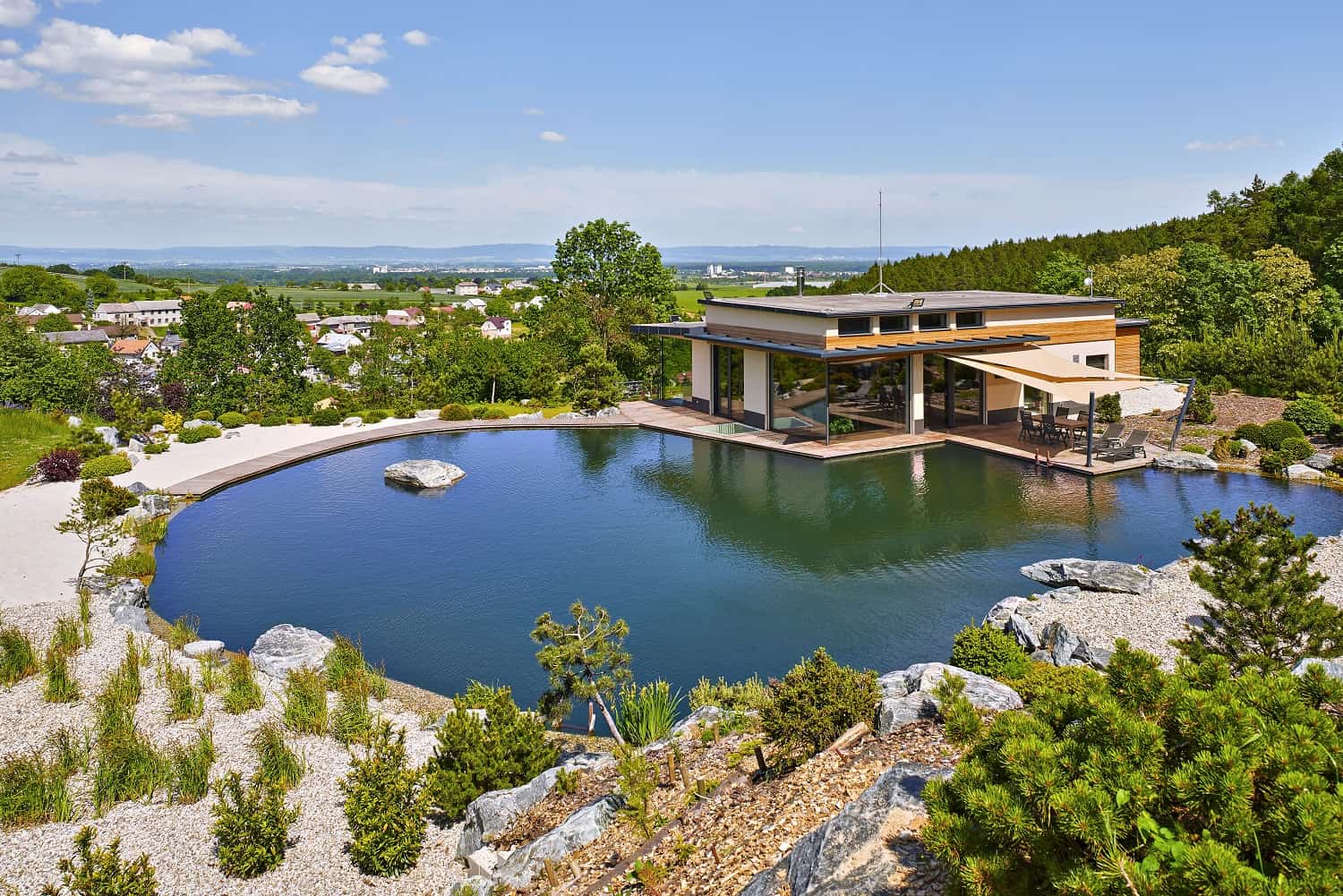 V bujaré zeleni na konci malebné obce nedaleko Olomouce stojí na kopci zcela výjimečný rodinný dům, který realizovala firma specializující se na stavbu jezírek. Ojedinělá prosklená stavba citlivě zapadá do krajiny a nabízí nádherné výhledy do okolí. Její specifický výraz umocňuje velké jezero s kameny, vodopády a horskou flórou.