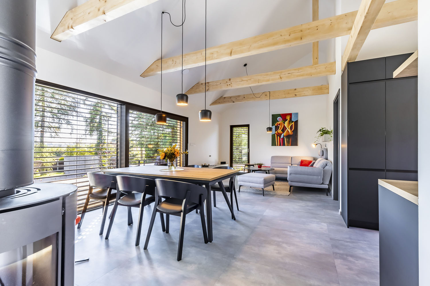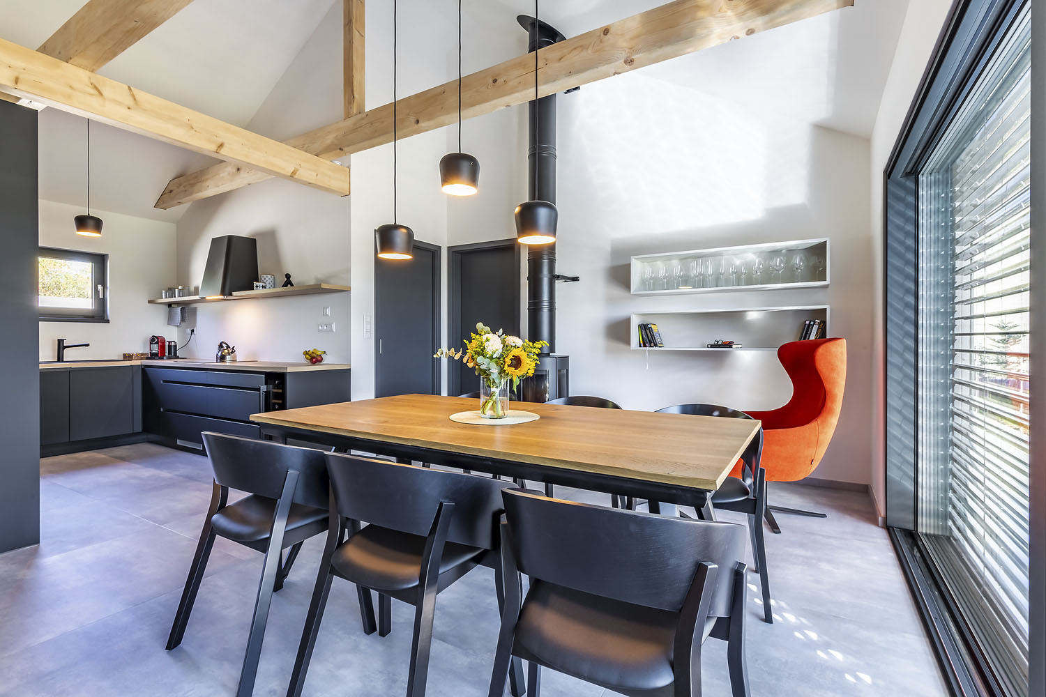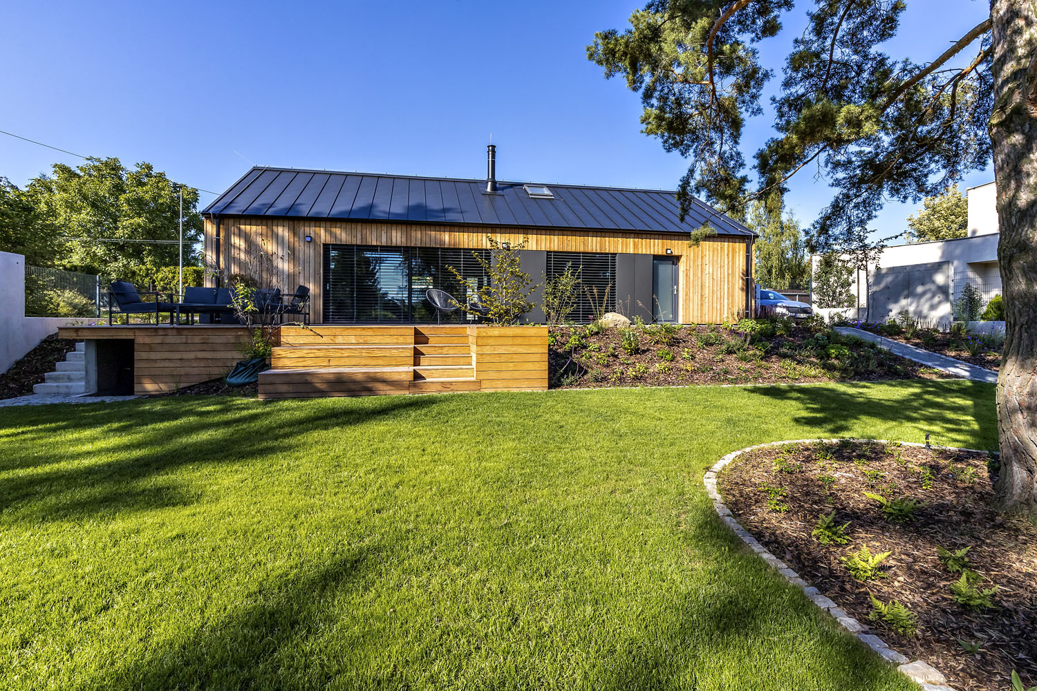 Těšili se, že nový dům bude rodině poskytovat co nejvíce pohodlí a minimum starostí. A to se jim také vyplnilo. Stavba je situována v horní části pozemku u příjezdové komunikace a orientována rovnoběžně s ulicí. Obytné místnosti mají okna do zahrady, prostory zázemí na opačnou stranu směrem do ulice. Obdélníkový tvar se sedlovou střechou se dobře hodí do zdejšího prostředí na rozhraní města a vesnice. Design „dřevěné“ architektury je moderní: kompaktní stavba s velkými prosklenými plochami a minimálními střešními přesahy, hladká střecha z falcovaného titanzinkového plechu.
