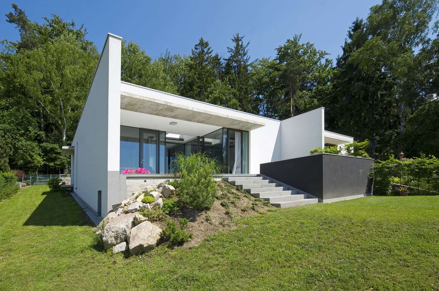 Dvě spřátelené rodiny s dospělými dětmi projevily zájem o maximální využití poměrně malého pozemku (necelých 1 500 m2) na jižní stráni nad městem Libercem. Chtěly ryze praktické bydlení se zahradou, které zohledňuje občasné návštěvy dětí a zároveň není náročné na provoz a údržbu. Nakonec padla volba na dvojdomek, který bude celoročně sloužit rodičům a návštěvám bude poskytovat dostatečný komfort.
