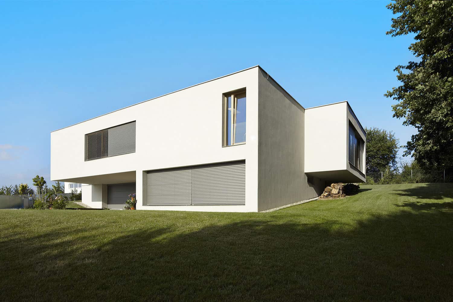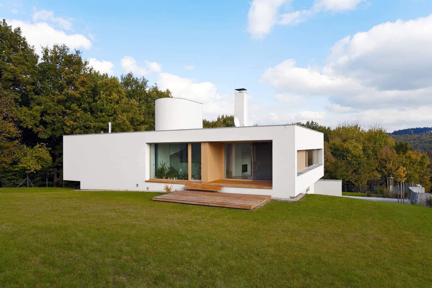 Geometrické tvary na první pohled připomínají typickou geometrickou kompozici funkcionalistické vily, ve skutečnosti však architekt Pavel Míček, autor návrhu domu, vyšel především z jedinečného místa a zadání. Majitelé si představovali dům pro čtyřčlennou rodinu s prostorným obývacím pokojem, krásnými výhledy, třemi ložnicemi, pracovnou, adekvátním sociálním příslušenstvím a lehce nadstandardním zázemím – kromě velké dvojgaráže, zimní zahrady a sauny to také znamenalo nepodcenit kuchyň, koupelny, šatny, domácí práce, úložné prostory. V celém domě je patrný důraz na dostatečnou užitnou plochu, praktické uspořádání a kvalitní materiály.