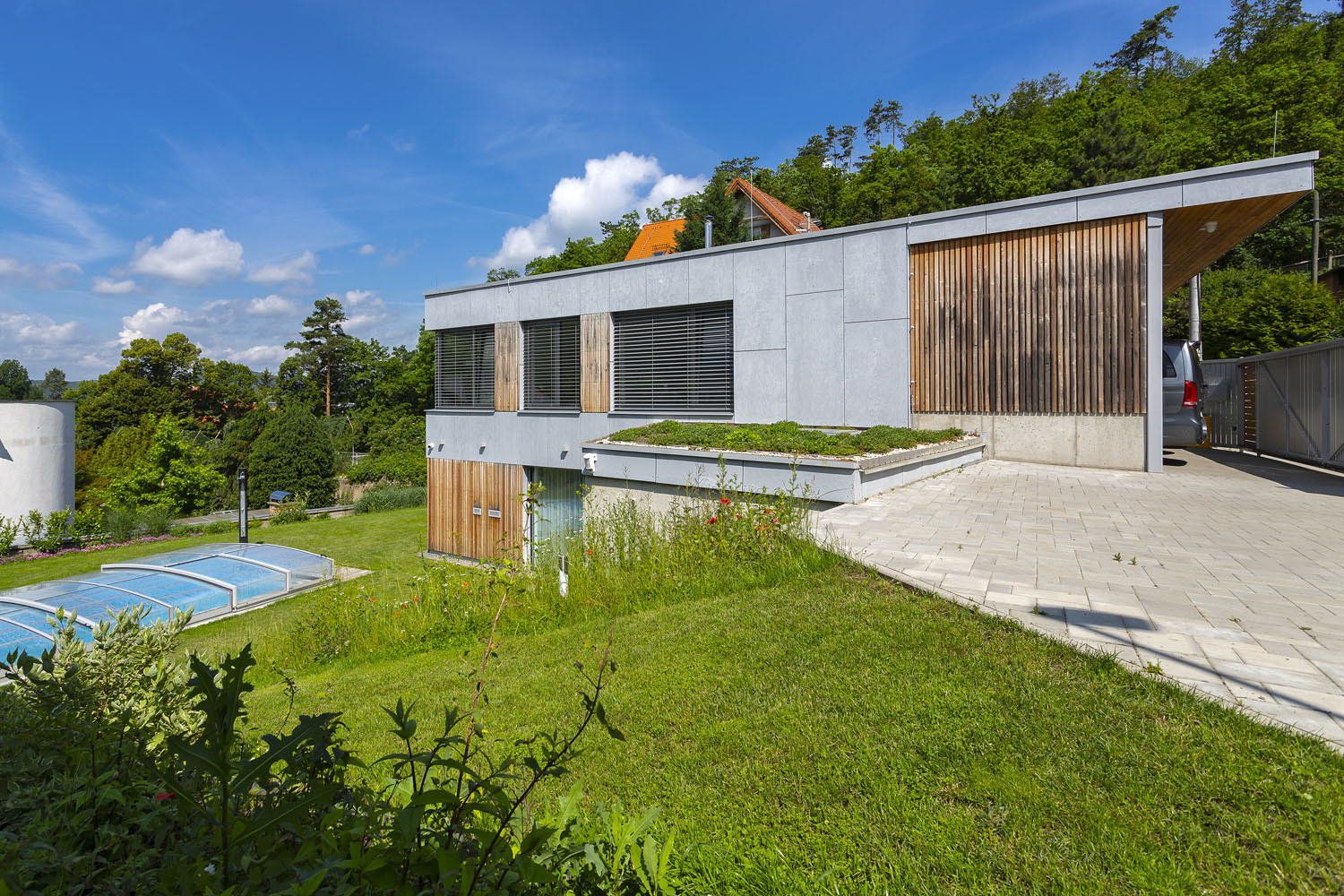 U zrodu domu stály od počátku šťastné okolnosti. Mladá rodina získala pozemek od devadesátileté dámy, která zde bydlí desítky let a před časem prozíravě koupila parcelu ve svahu pod vlastním domem, aby nepřišla o úchvatné výhledy. Nyní jej přenechala svému vnukovi, avšak se stejnou podmínkou. Akceptovala moderní prosklenou architekturu, která vzhledem k místní funkcionalistické prvorepublikové zástavbě není tomuto prostředí cizí, a plochá střecha byla zárukou, že možnost i nadále se dívat na krásné Křivoklátsko jí zůstane zachována.