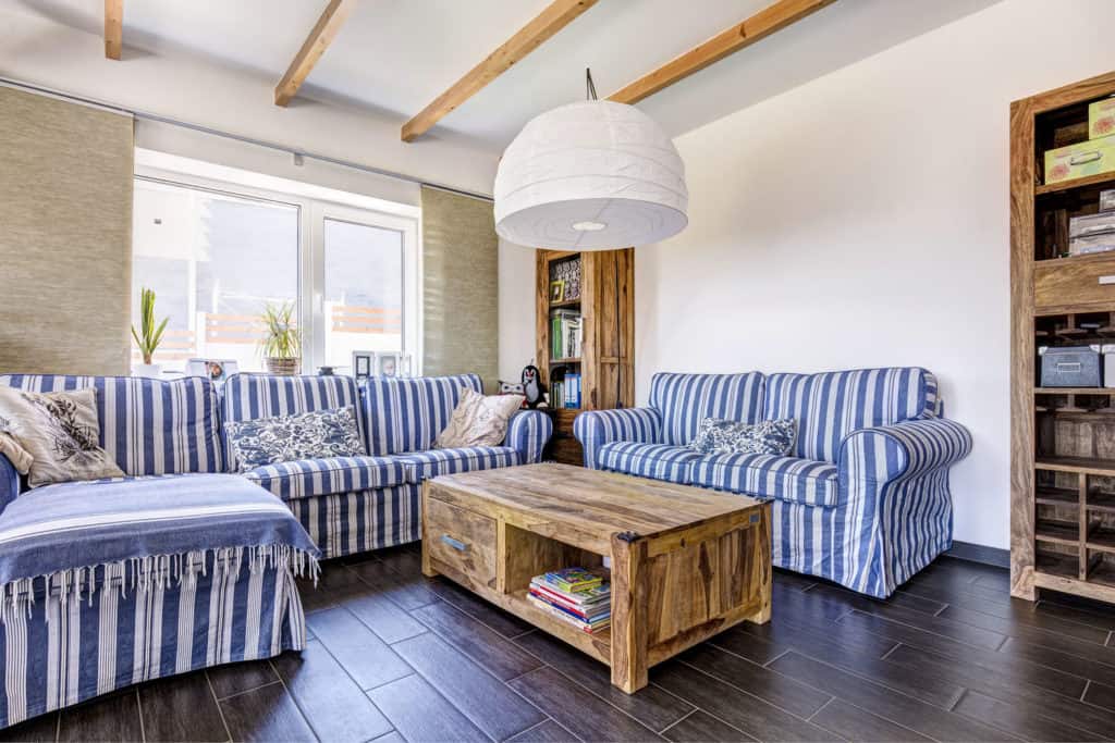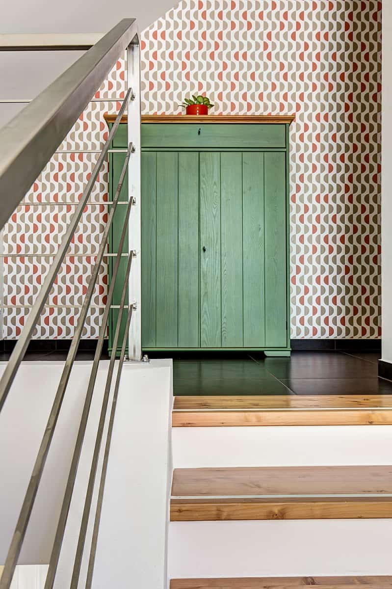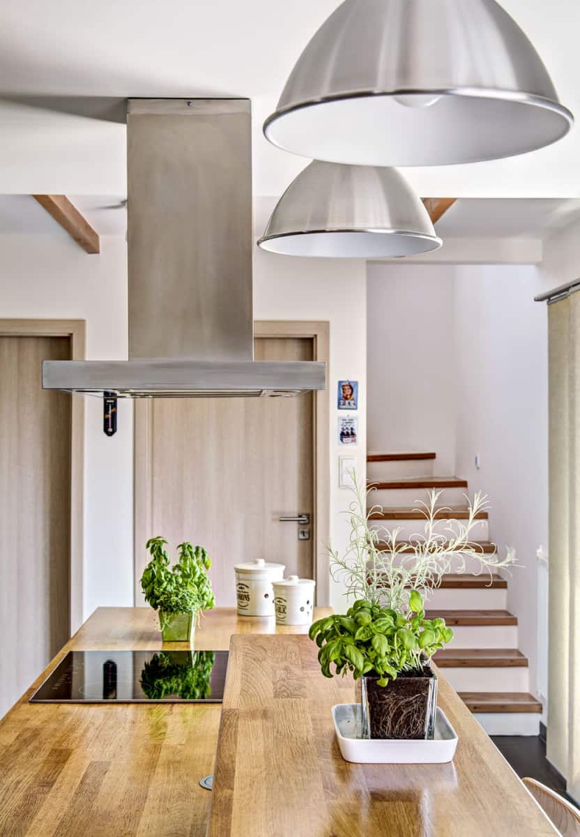 Přízemí domu se kromě obytné místnosti skládá i z kuchyňského koutu, menší koupelny, Martinovy odpočinkové místnosti a komory pod schody, v níž rodina skladuje převážně potraviny. V patře se nachází ložnice, proti koupelně samostatná šatna a dvě místnosti určené pro budoucí dětské pokoje, jeden z nich nyní slouží pro hosty. Na vybavení interiéru spolupracoval architekt s majiteli jen částečně – společně vybírali například podlahy a obklady. „Základní koncept rozmístění nábytku v hlavním obytném prostoru klient ctil a obrátil se na mě i s návrhem kuchyňské linky a jídelního stolu. Ostatní kusy nábytku si Martin se Simonou vybrali sami,“ říká Michal Prášil.