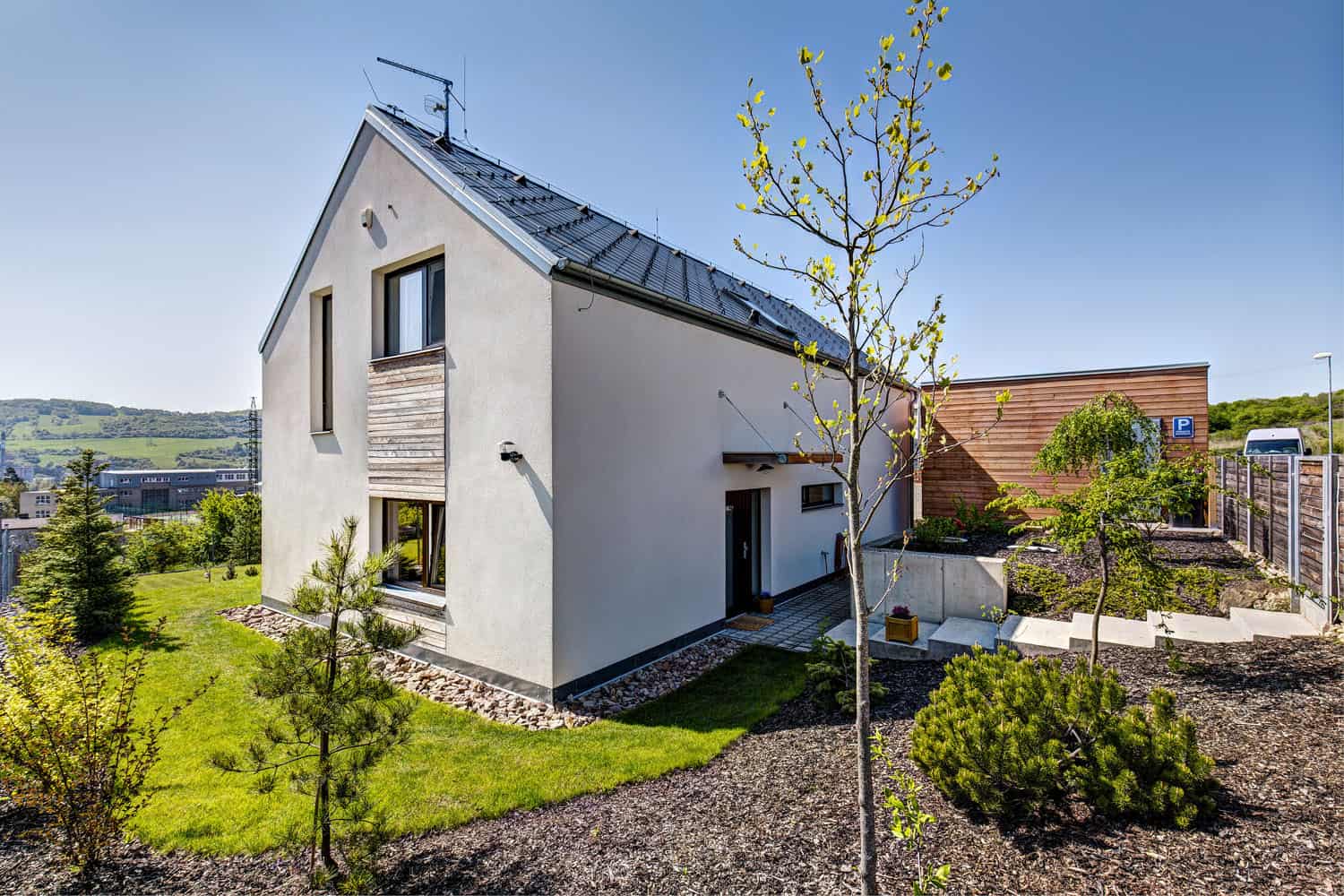 Snadná dostupnost do většího města, kompletní vybavenost obce a pěkná příroda v okolí – takové jsou většinou požadavky mladých párů při výběru lokality pr o stavbu rodinného domu. Dům na svažitém pozemku na kopci nad Loděnicí nabízí majitelům navíc pěkný výhled a pohodlné zázemí pro spokojený život.