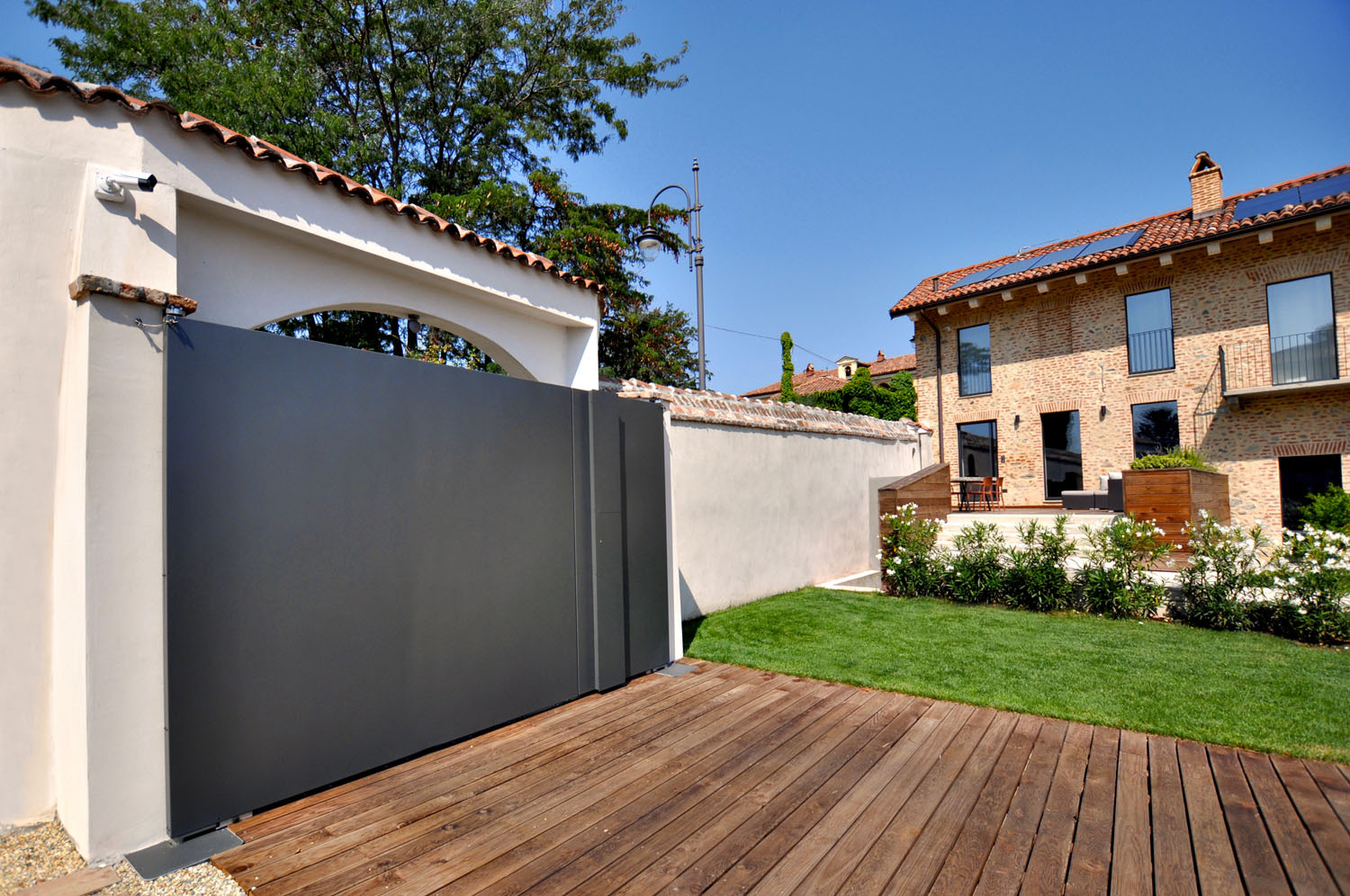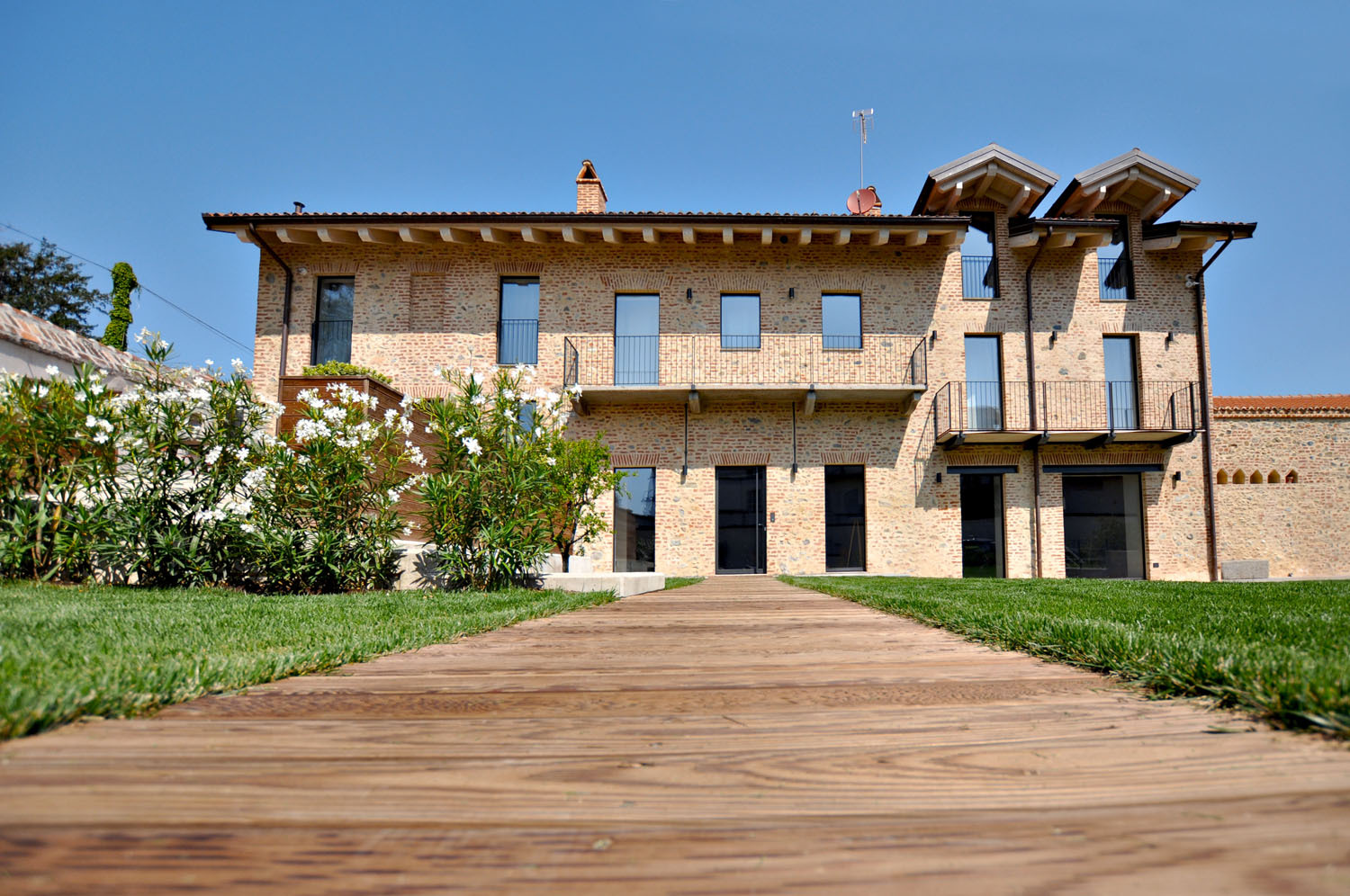 Dvůr s vysokou zdí a obloukovou vjezdovou bránou, dlouhé stavení se sedlovou střechou a štítem orientovaným do ulice, „slepenec“ z cihelného zdiva tu a tam smíšeného s kamenem, v jedné části klenby, v druhé dřevěné stropy… Jak je vidět, u nás i v Itálii se na venkově v minulosti stavělo podobně – občas metodou „co dům dal“. A právě schopnost přizpůsobit se, poradit si i se skromnými prostředky, dnešním jazykem řečeno improvizovat, dává takovýmto budovám autentické kouzlo. Jen je třeba jej objevit a vykřesat z balastu.