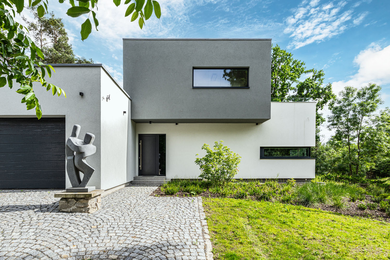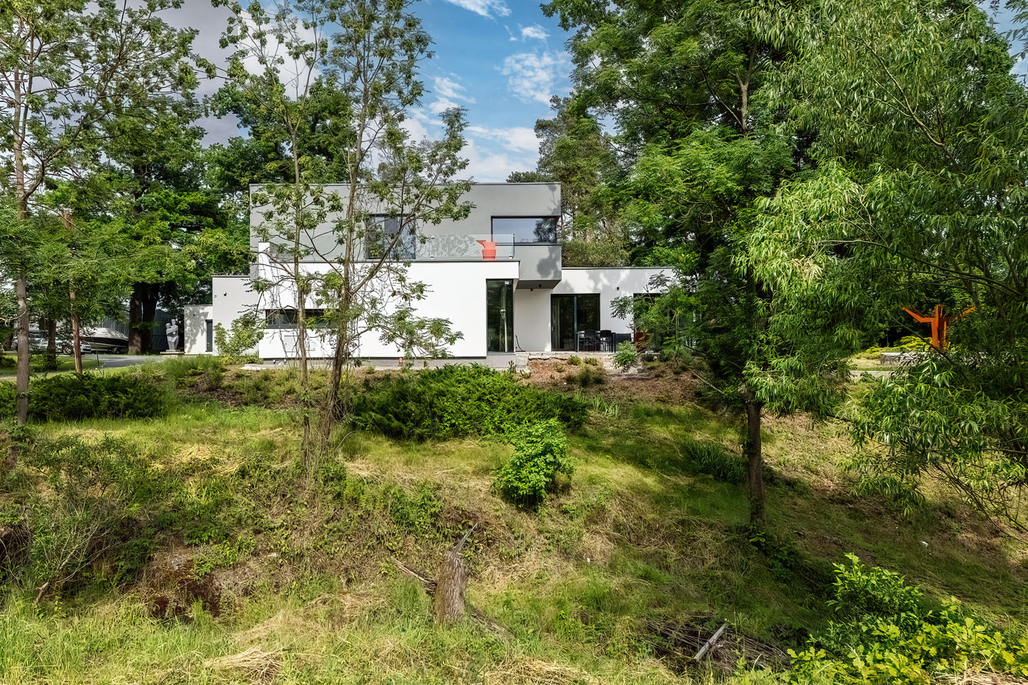 Stavební předpisy umožňovaly využít pouze stávající zastavěnou plochu, novostavba tedy „vyrostla“ na místě domu původního, na okraji svahu s jižní orientací. Na dvou navzájem posunutých bílých kostkách spočívá přesahující šedý kvádr. Přesahující hmota přirozeně kryje vstup do domu na straně jedné a terasu na straně druhé. Všechny hmoty jsou odlehčeny velkými okny a prosklenými rohy bez sloupků.