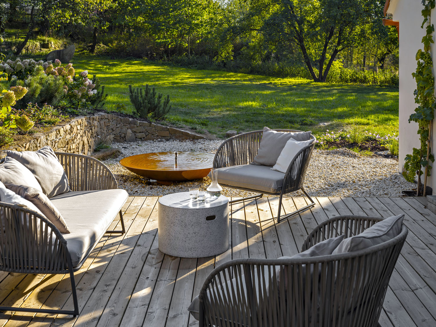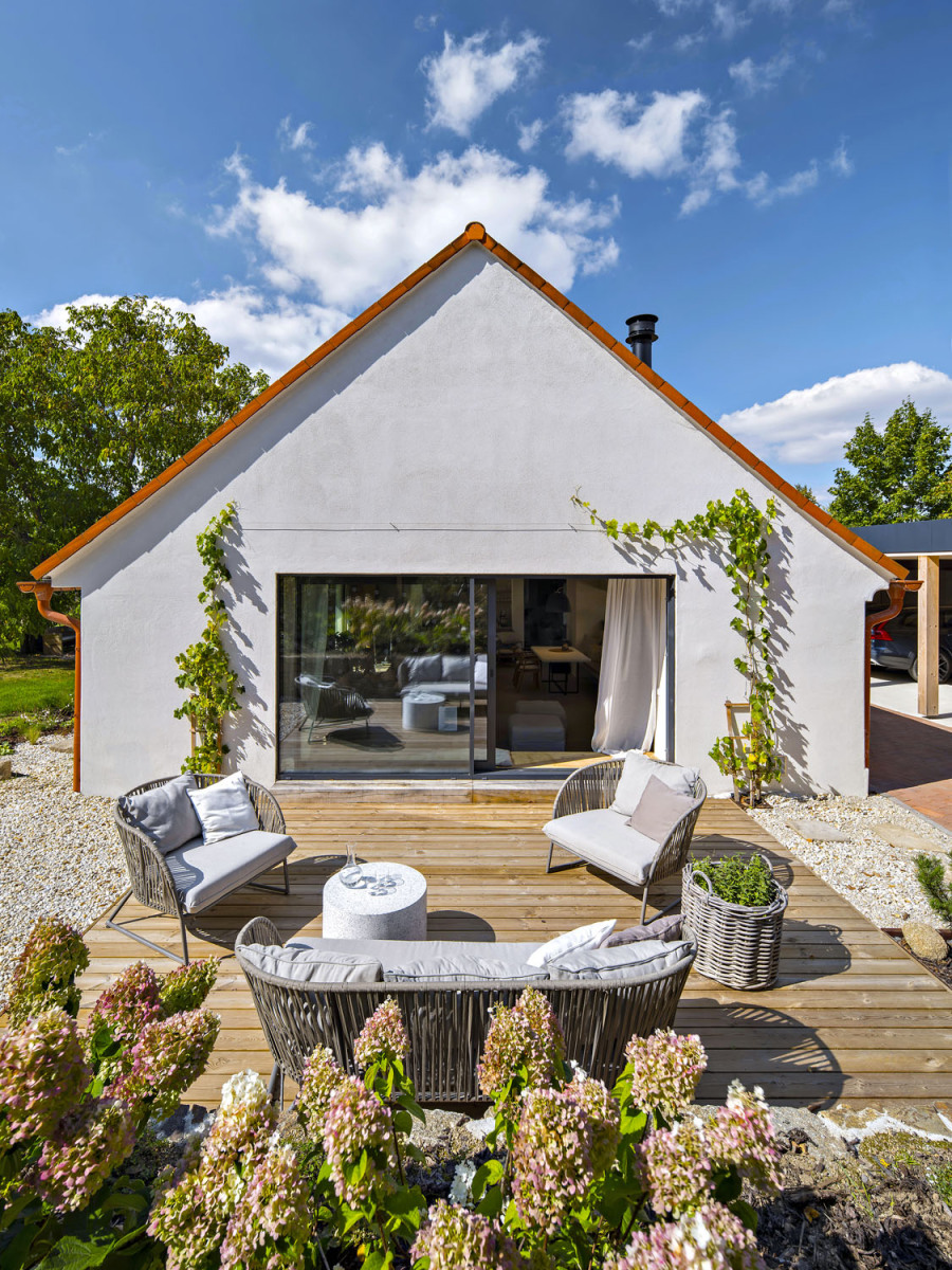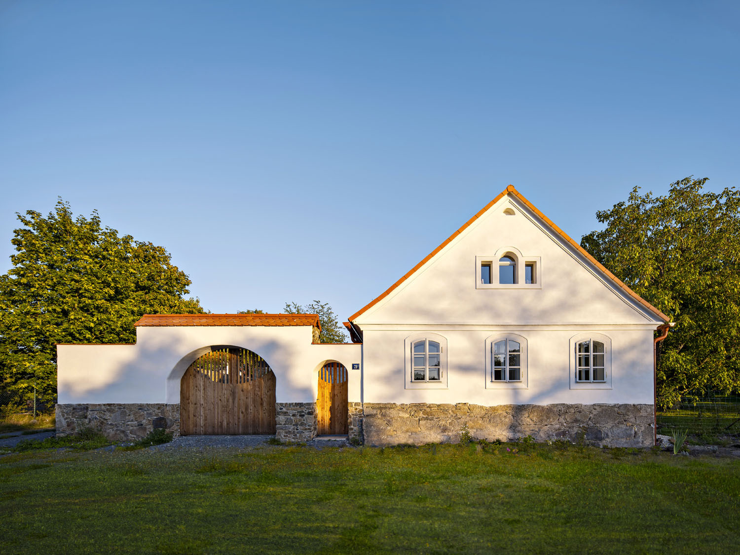 Průčelí venkovské usedlosti na první pohled připomene obrázky Josefa Lady, vrací nás do starých časů. A stejně jako u tohoto autora je i tady nedaleko les; místo hospodářského dvora je však u domu krásná velká zahrada se starými stromy. Zdání klame, před rekonstrukcí byl dům ve velmi špatném stavu, zbylo z něj jen obvodové zdivo a střecha. Pro autory projektu to ale nebyl špatný začátek, dostali tak svobodu, nic je příliš nesvazovalo. Když tedy vstoupíme, zjistíme, že do zahrady se interiéry otevírají velkorysými okny, pro pobyt venku jsou tu také dvě terasy.