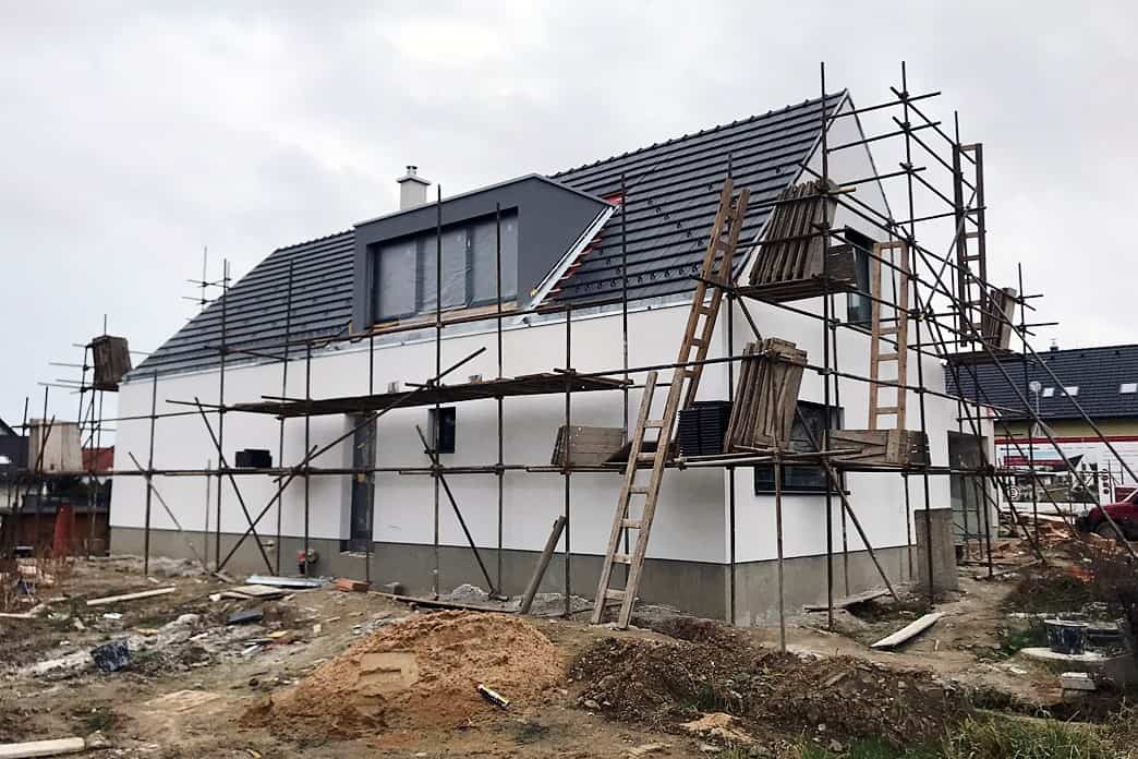Ke konečné povrchové úpravě fasády byla použita difuzně otevřená omítka Nanopor od firmy Baumit