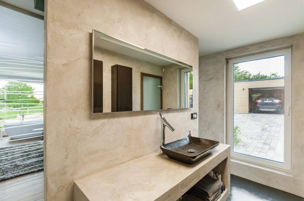 Stěrka je exkluzivním řešením povrchu stěn a můžete ji mít prakticky ve všech místnostech, a to včetně koupelny. Jedinou výjimkou je sprchový kout. Pan Závodný si zvolil stěrku i do sprchových koutů v obou koupelnách a zároveň zde pro dosažení tepelného komfortu instaloval topení.