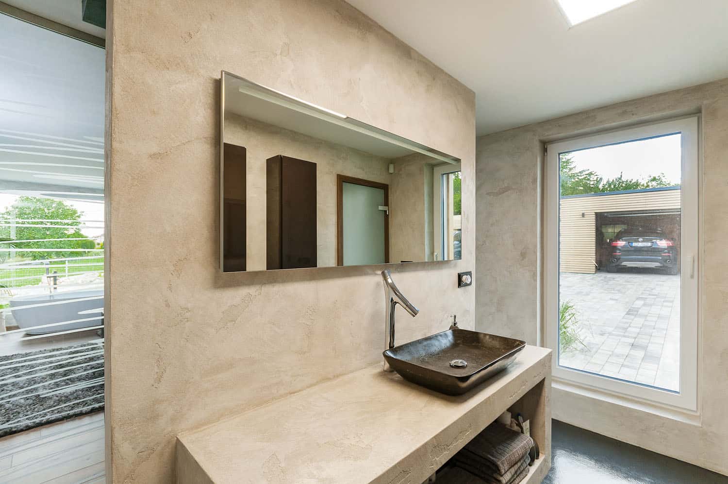 V domě pana Závodného nenajdete v koupelnách dlaždice, ale jako milovník minimalismu vše řešil pomocí stěrky. Podle jeho slov stěrka nabízí velmi hodnotné estetické řešení, ale je náročná na provedení. Nejvíce chyb se podle něho dělá u stěrky ve sprchovém koutě.